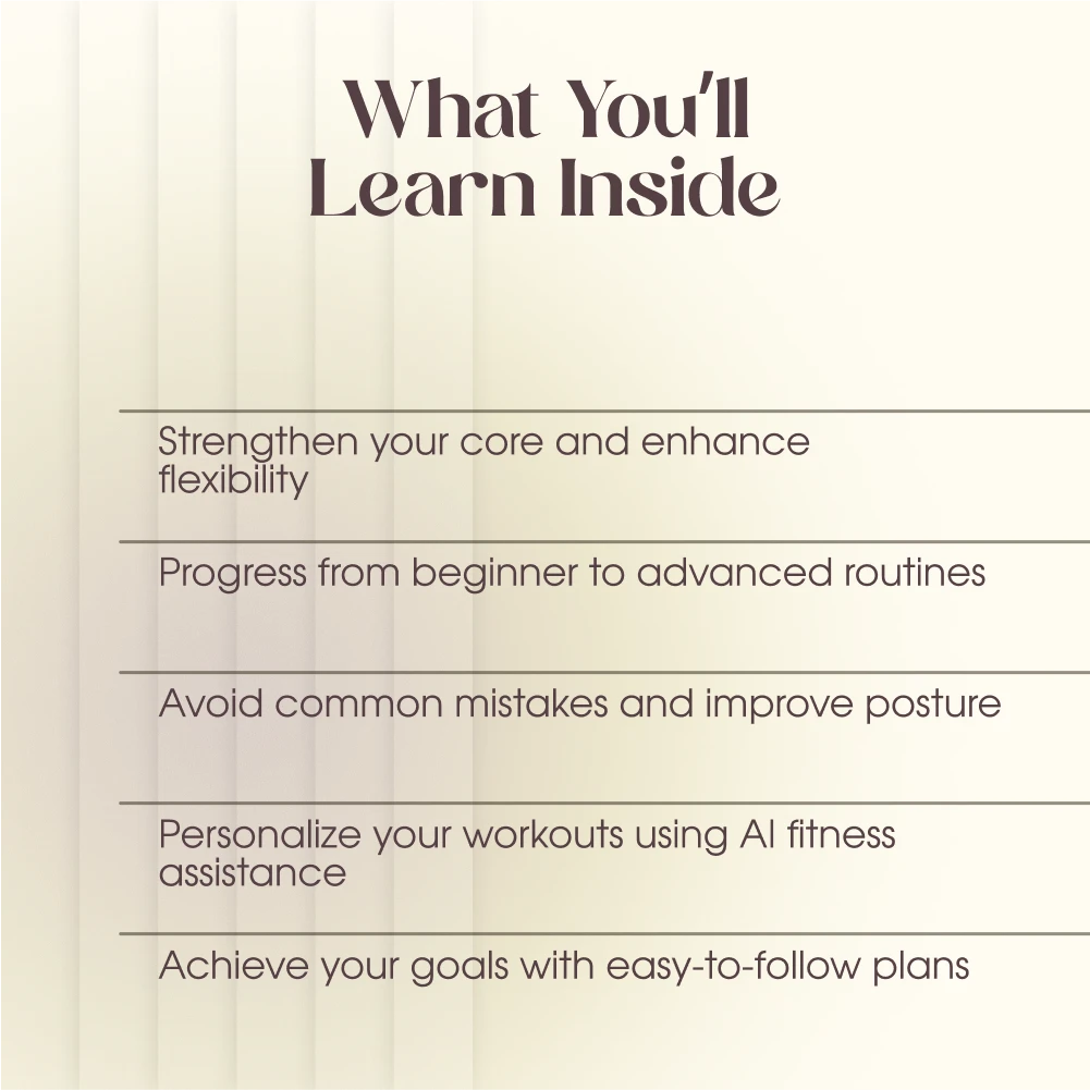 - Chapter 7: AI-Powered Pilates Assistance – Use AI fitness coaches to get personalized Pilates plans and optimize your workouts.
