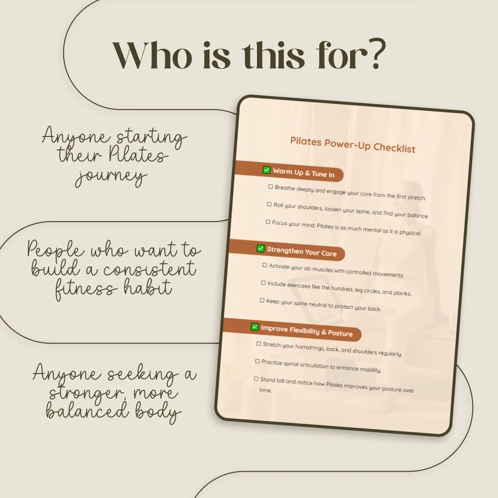 Have you ever wondered what all the buzz around Pilates is about? What is Pilates good for, truly? It’s more than just a workout; it’s a transformative practice that builds a rock-solid core, melts away tension, and teaches your body to move with grace and power. But starting can feel overwhelming. That’s where our Pilates Power-Up Checklist comes in. This beautifully designed digital guide cuts through the confusion, giving you a clear, step-by-step path to follow in every session. Stop guessing and start flowing with a checklist that empowers you to harness the full mind-body benefits of Pilates, from warm-up to cool-down.