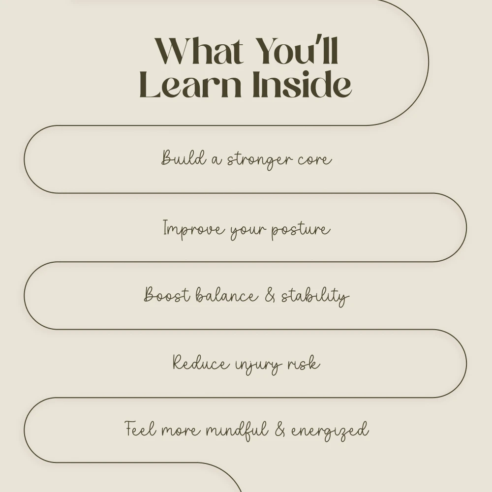 - Improve Flexibility & Posture: This section guides you to stretch your hamstrings, back, and shoulders regularly. You’ll practice spinal articulation to enhance mobility and learn to stand tall, noticing how Pilates improves your posture over time.