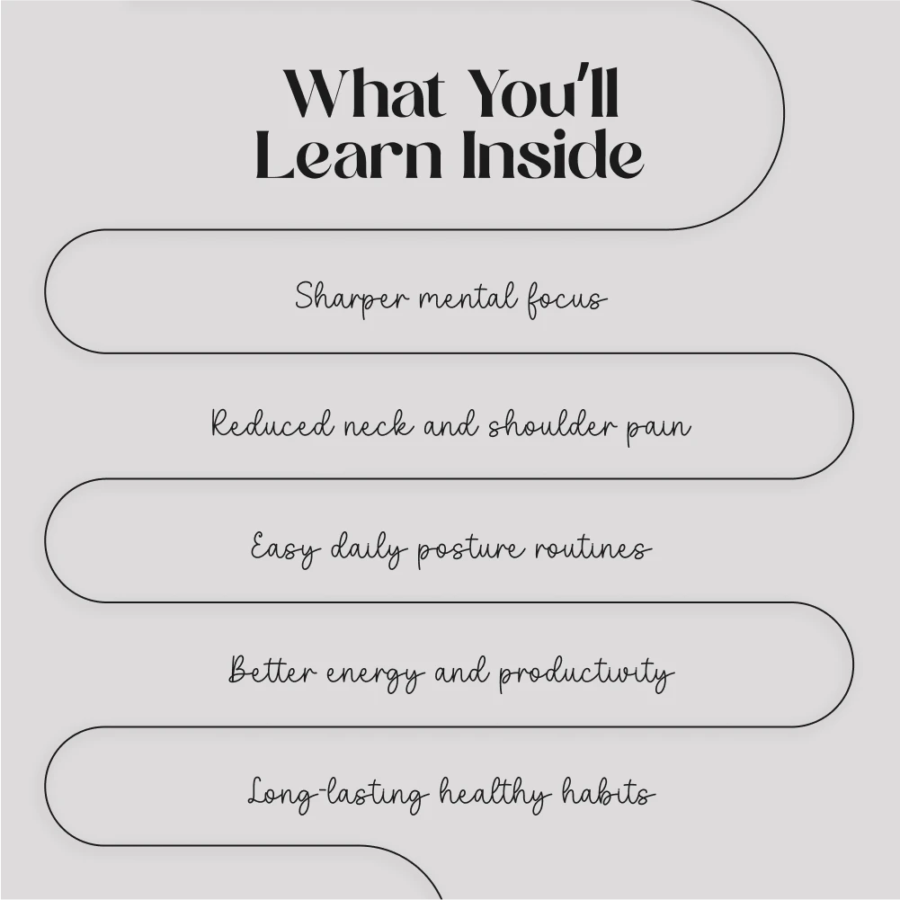 This guide is perfect for remote workers, students, entrepreneurs, or anyone who spends long hours sitting and wants a simple, practical way to feel better and work smarter. Unlike generic posture guides, this resource combines posture science with real-life applications for focus and mental performance.