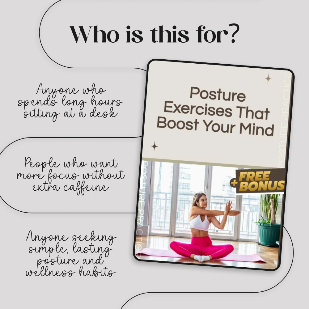 Discover how small changes in your posture can lead to big improvements in clarity, focus, and energy. Posture Exercises That Boost Your Mind is a carefully designed digital download that blends science-backed strategies with easy-to-follow routines. Whether you’re working at a desk, balancing remote life, or simply wanting to feel sharper and more energized, this eBook, guide, and posture checklist will help you align your body and unlock your full mental potential.