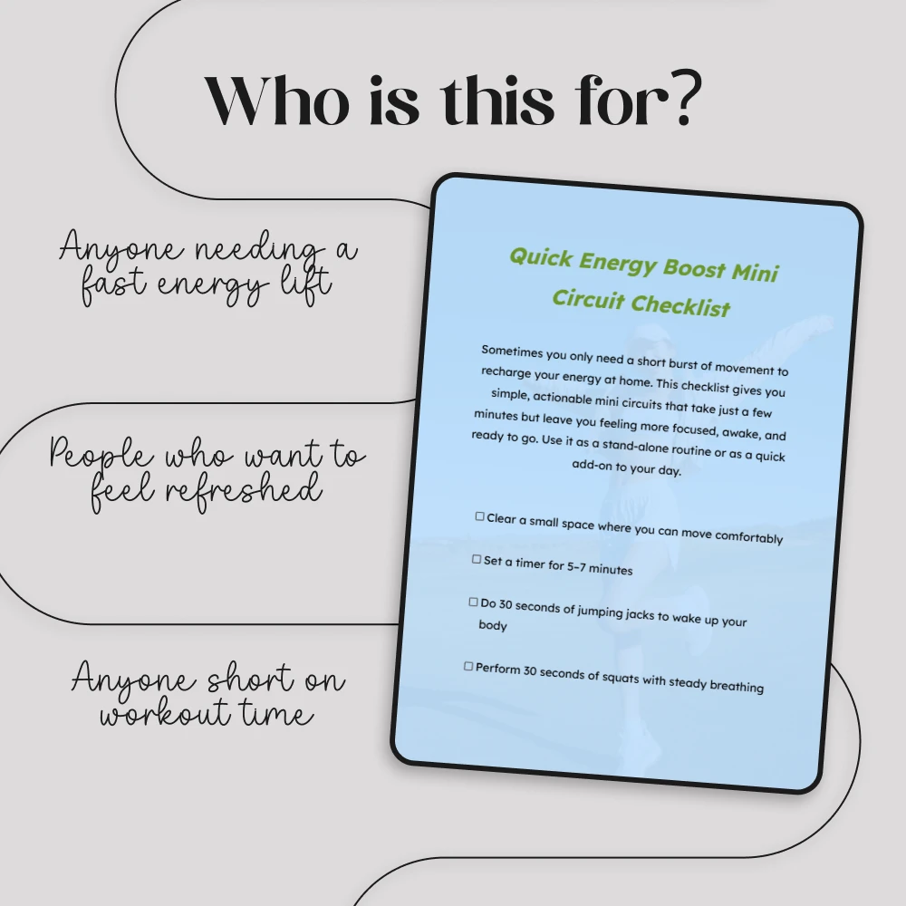 This checklist is perfect for anyone who needs a quick, energizing break—whether you’re working from home, studying, parenting, or simply want to build a consistent wellness habit. Ideal for beginners, busy professionals, or anyone who wants to incorporate energy-boosting mini circuits at home without complicated routines or gym equipment.