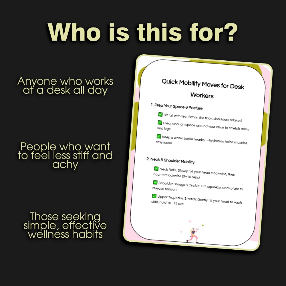 This guide is perfect for anyone who spends hours at a desk. Whether you’re a remote employee, a busy executive, a student, a gamer, or a freelancer, if you work seated, this is for you. It’s for those who want to take proactive control of their physical health but need a straightforward, no-fluff plan that fits into a hectic schedule.