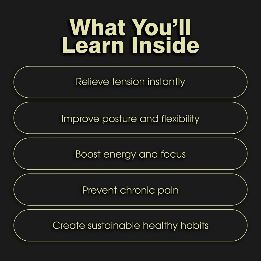 - Hip & Lower Body Mobility: Combat the tightness caused by prolonged sitting with crucial stretches for your hips, glutes, and legs.
