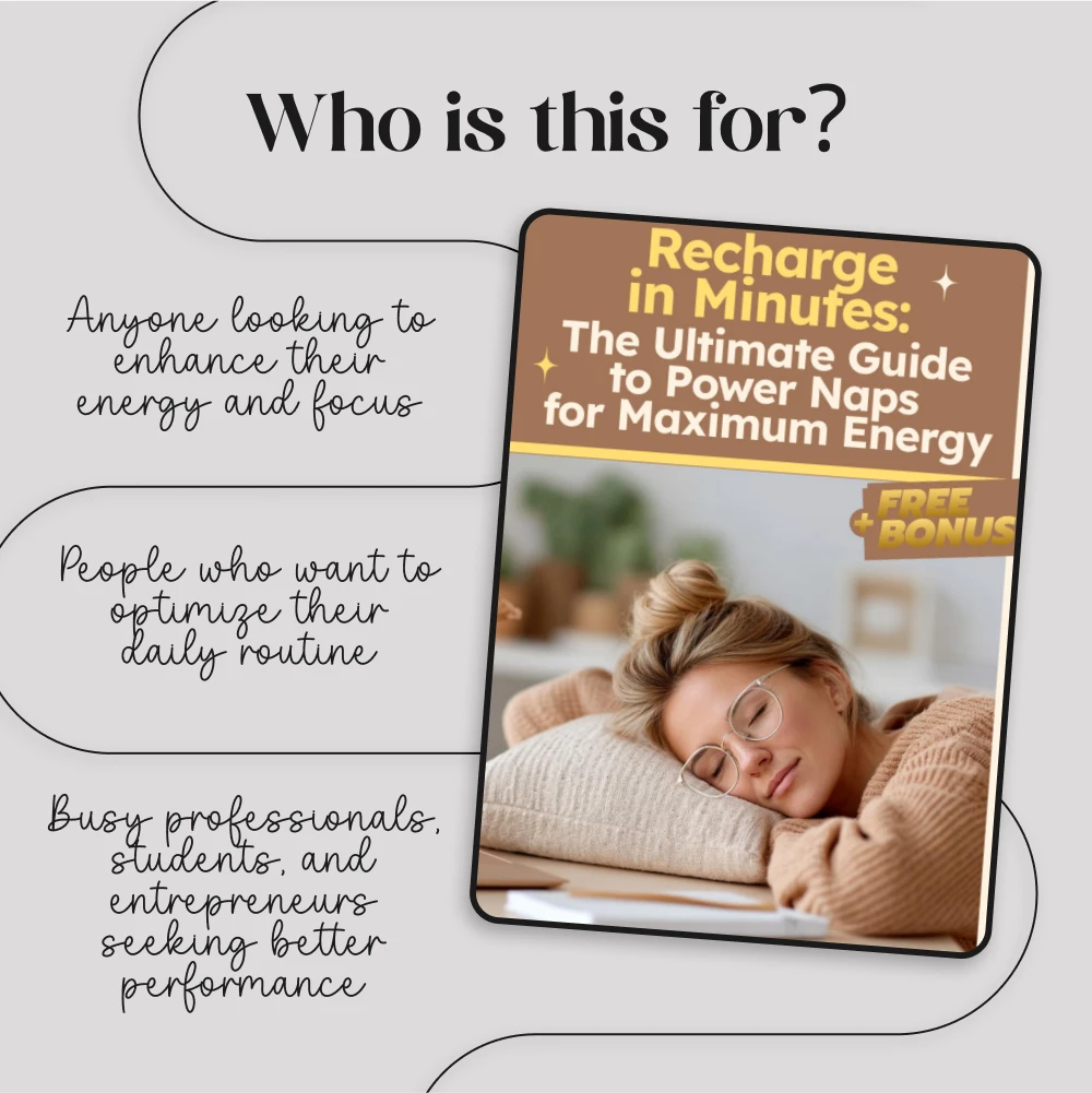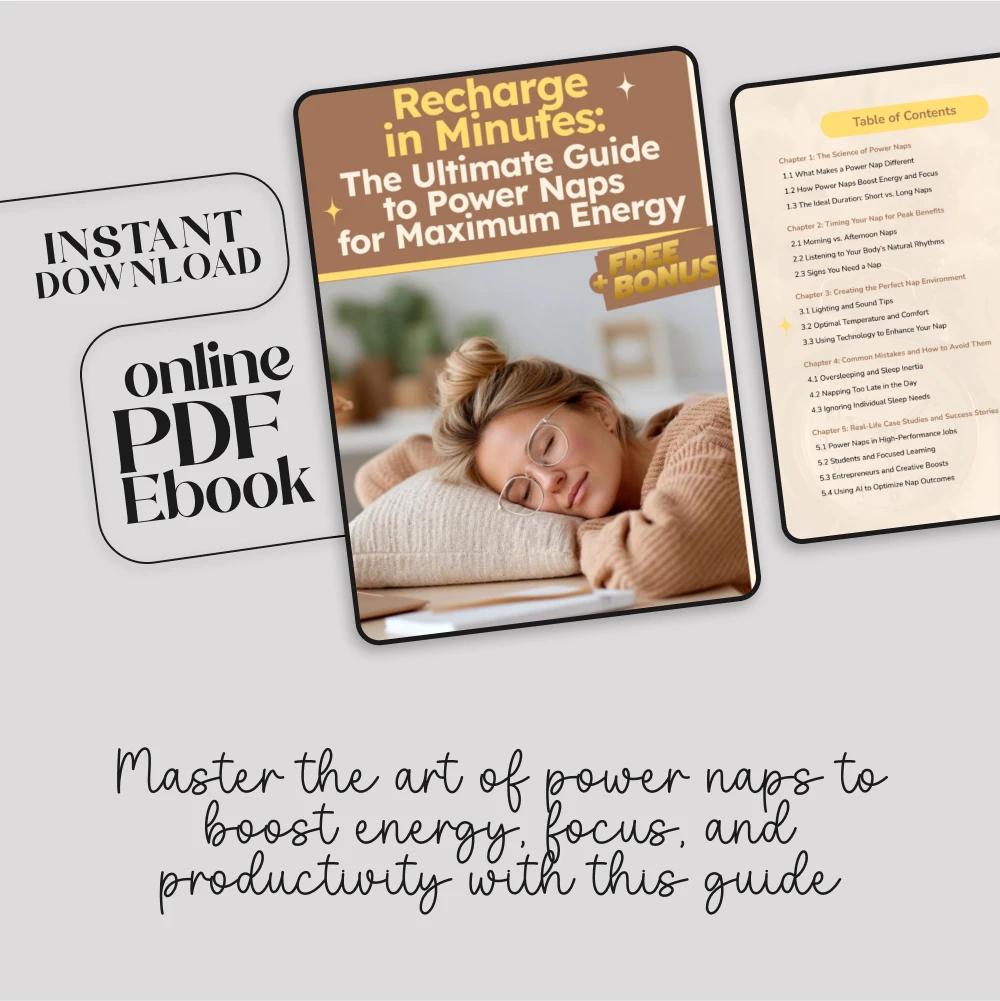 Discover the secret to boosting your energy and focus with the Recharge in Minutes: The Ultimate Guide to Power Naps for Maximum Energy eBook! Whether you’re an entrepreneur, student, or busy professional, this digital guide reveals how to harness the power of quick, rejuvenating naps to optimize your productivity and well-being. Packed with expert advice, science-backed tips, and real-life success stories, this guide will show you how to make the most of your nap time. Learn how to rest smarter, not longer, and supercharge your day with energy that lasts!