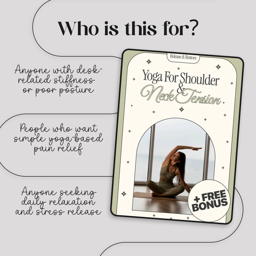 Don’t let tension control your day. Download your copy of Release & Restore: Yoga for Shoulder & Neck Tension today and start building a healthier, more relaxed body and mind—one gentle breath and stretch at a time.