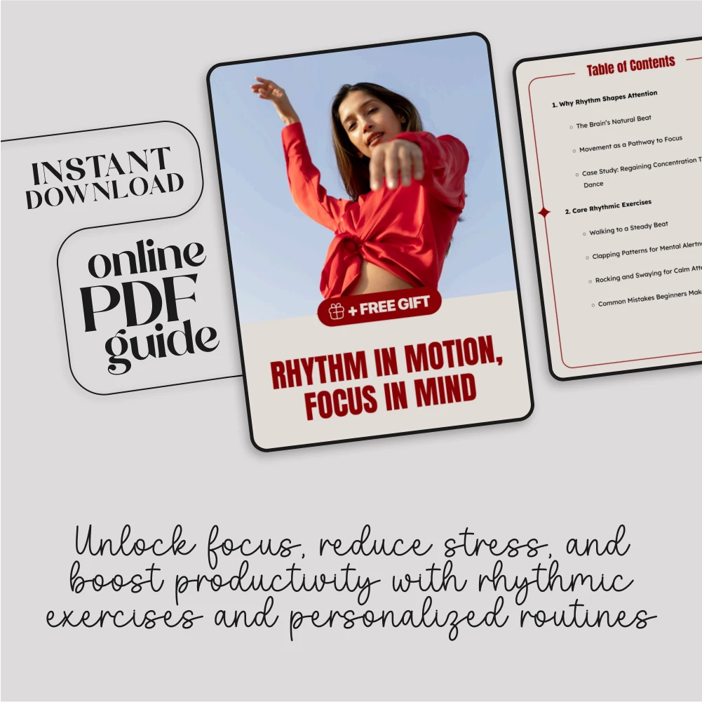 Unlock your mind’s full potential with the revolutionary digital guide, Rhythm in Motion, Focus in Mind. This easy-to-follow eBook introduces you to the powerful connection between rhythm, movement, and enhanced mental focus. Whether you’re looking to improve concentration, reduce stress, or gain clarity, this guide equips you with practical rhythmic exercises designed to transform your daily routine and elevate your productivity.
