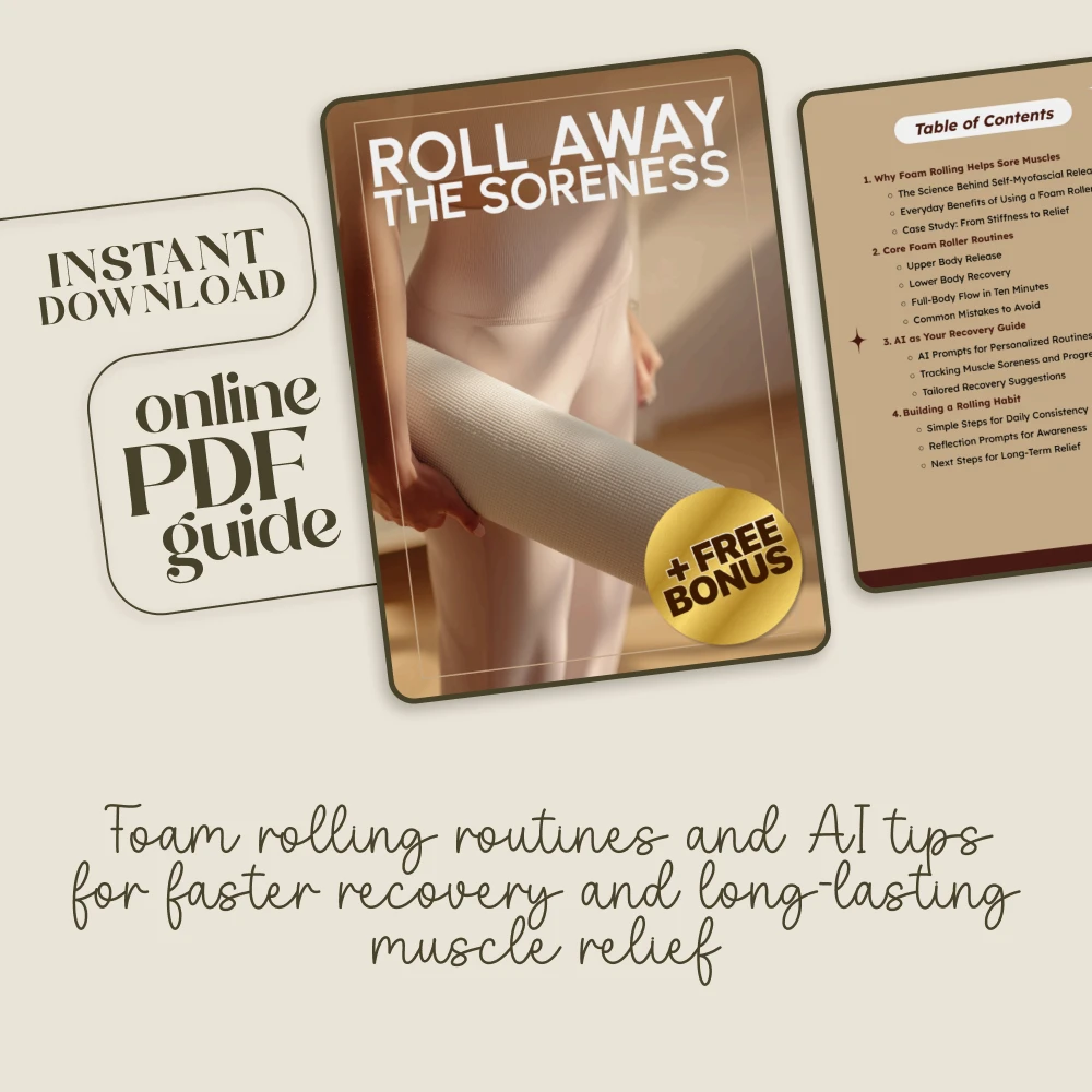 Say goodbye to stiffness and tension with Roll Away the Soreness, your complete digital guide to foam roller routines for sore muscles. Whether you’re an athlete, fitness enthusiast, or someone who simply wants to move with ease, this guide takes you through the science, routines, and daily practices that transform foam rolling into your go-to recovery ritual. Designed to be practical and easy to follow, it even integrates AI prompts to help personalize your sessions, making this more than just a guide—it’s a smart companion for your recovery journey.