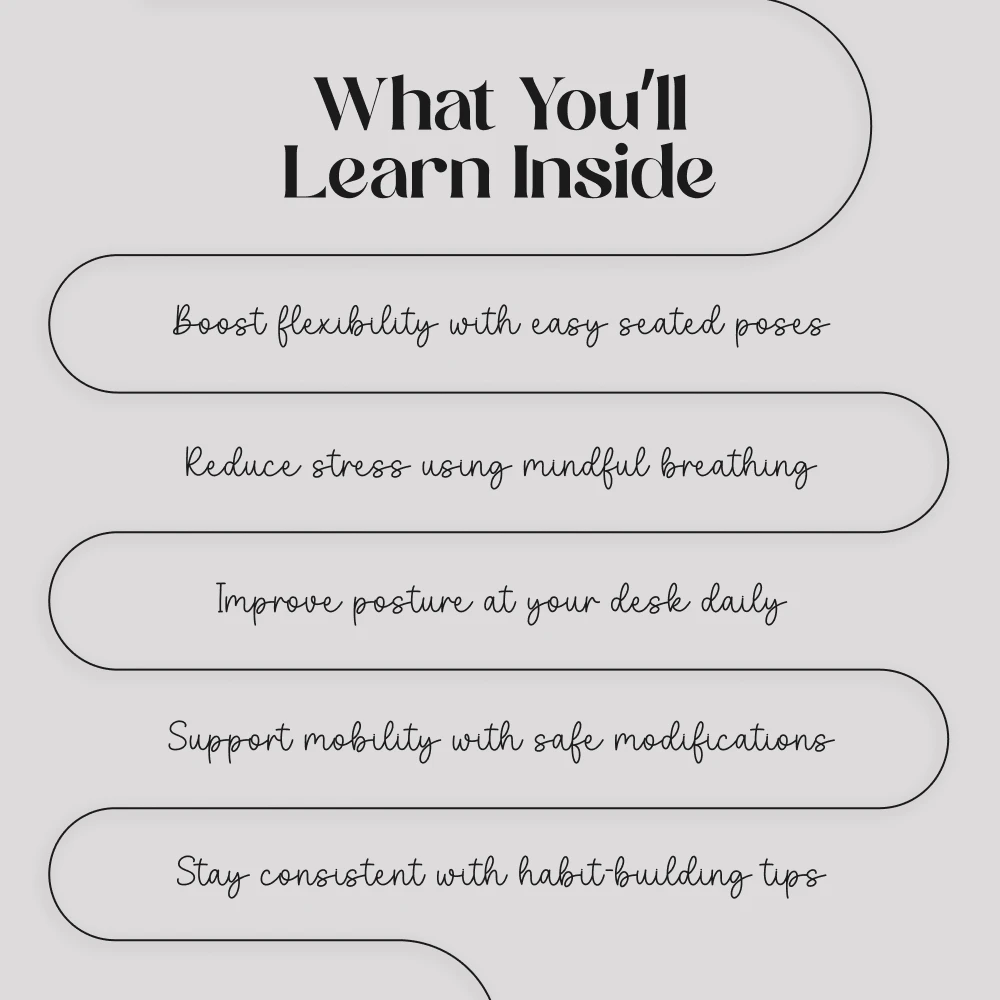 Take the first step toward everyday wellness with Sit, Stretch, Thrive: Chair Yoga for Everyday Wellness. Download your copy today and bring the benefits of chair yoga into your daily routine—anytime, anywhere.