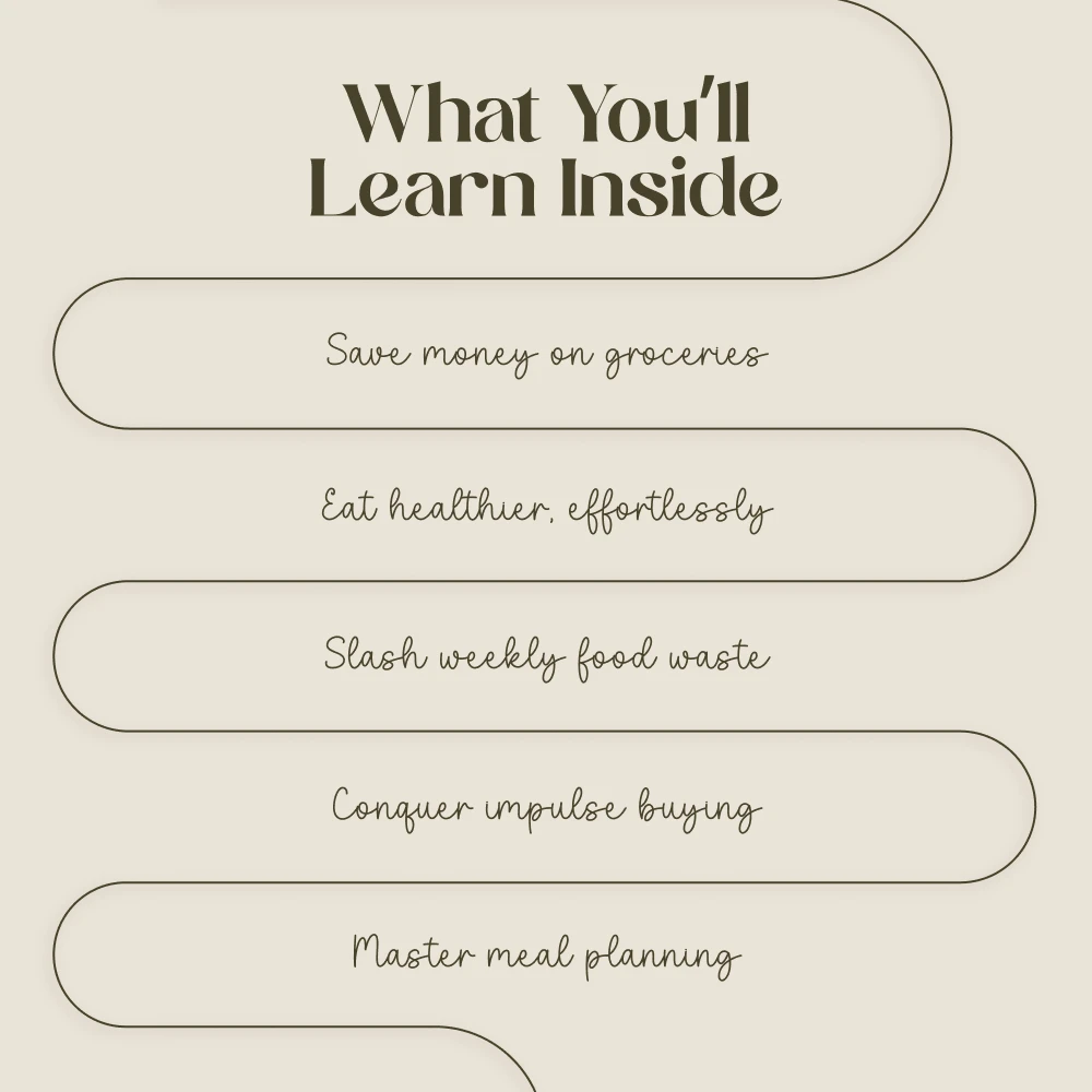 This instantly downloadable digital guide is packed with actionable strategies and simple steps to master your grocery shopping. Here’s a sneak peek at what’s inside: