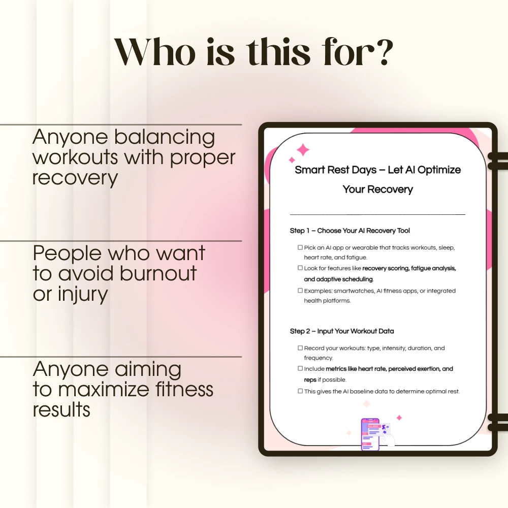 Unlike generic fitness recovery guides, this digital checklist walks you step by step through integrating AI tools for scheduling rest days into your training routine. It’s designed for people who want simple, clear instructions without unnecessary fluff. Every section is practical and actionable, ensuring you can implement what you learn right away. Whether you’re training for strength gains, marathon prep, or everyday wellness, you’ll find this resource easy to use and highly adaptable.