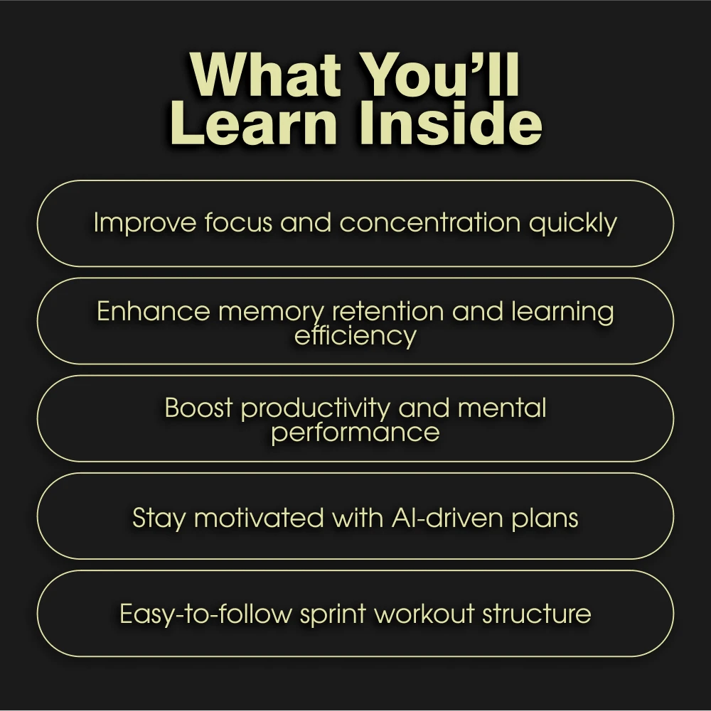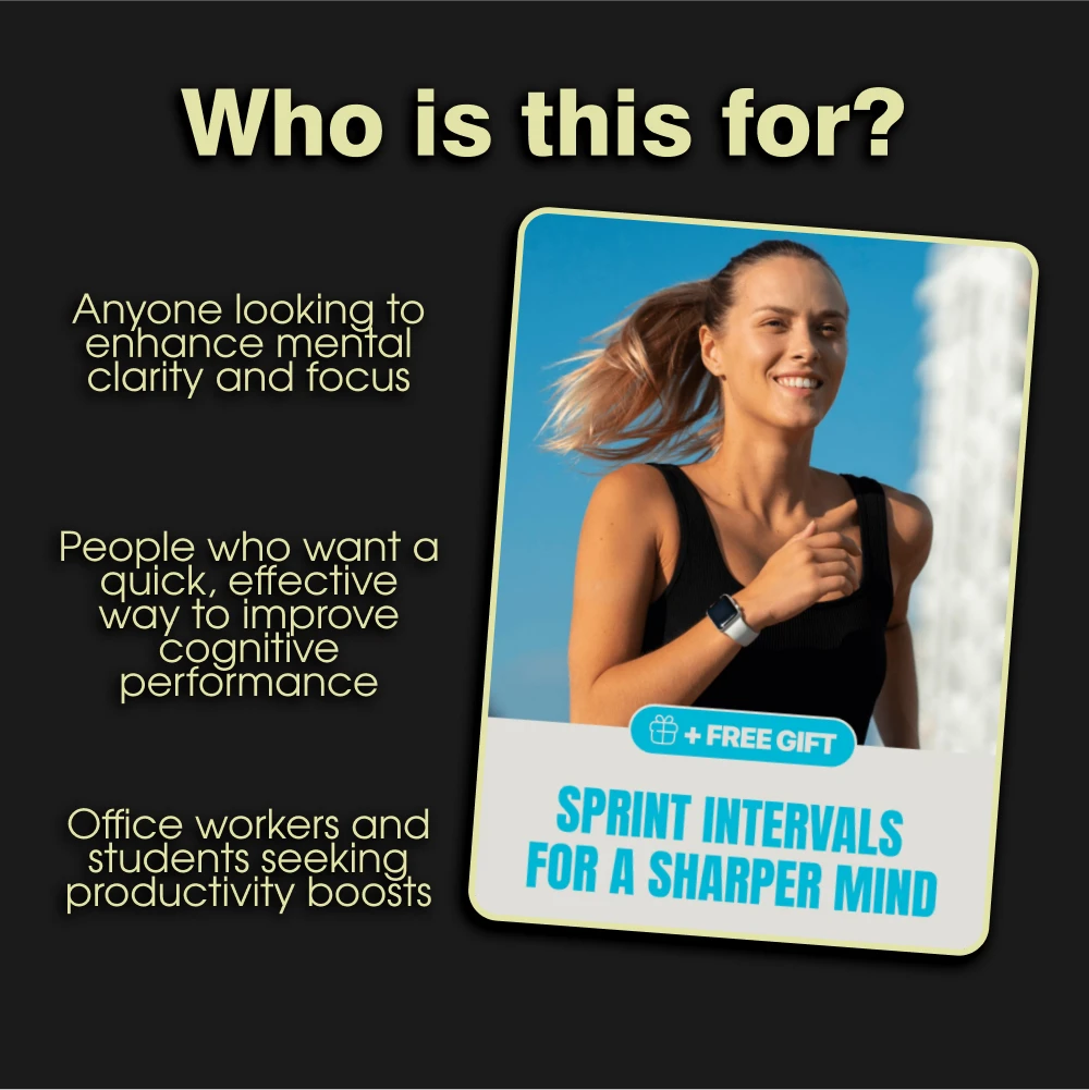 This eBook is perfect for anyone looking to enhance their mental performance through simple yet effective sprinting techniques. Whether you’re an office worker looking to boost focus, a student needing better retention and cognitive power, or someone seeking a new way to improve brain health, “Sprint Intervals for a Sharper Mind” is tailored to your needs. It’s a must-have resource for anyone seeking mental clarity and focus with minimal time investment.