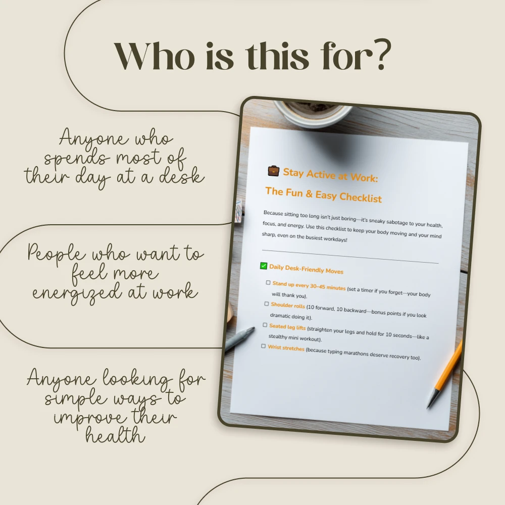 Unlike generic blog posts or intimidating fitness plans, our checklist is built on practicality and personality. We don’t just tell you to “move more”; we give you the exact how, when, and why in a fun, non-judgmental format. The focus is on micro-movements that add up to massive benefits, making it the easiest and most effective tool to truly stay active at work.