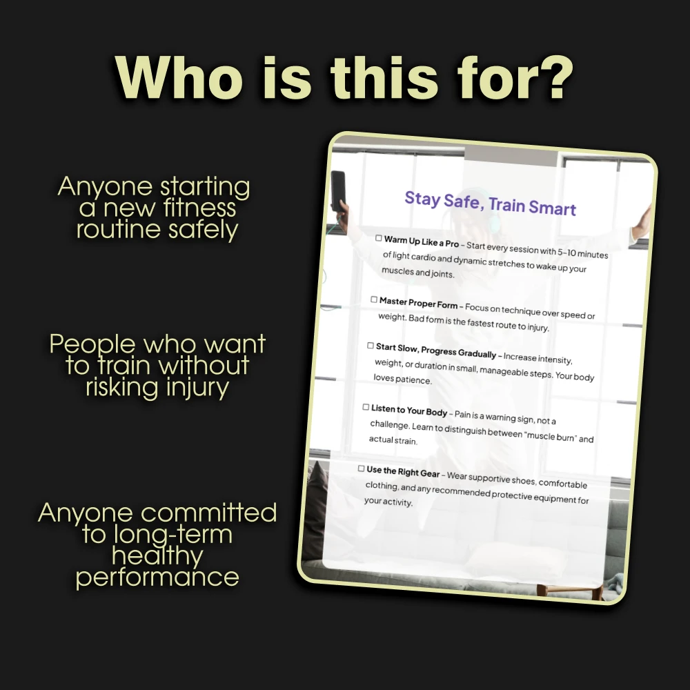 Every workout should help you get stronger, not sideline you with an injury. Stay Safe, Train Smart is a practical, easy-to-follow digital checklist designed to keep fitness enthusiasts of all levels safe during exercise. Whether you’re new to training or experienced, this guide shows you exactly how to prevent injuries during workouts with clear, actionable steps. From warming up effectively to knowing when to seek professional help, you’ll have a reliable safety plan at your fingertips.