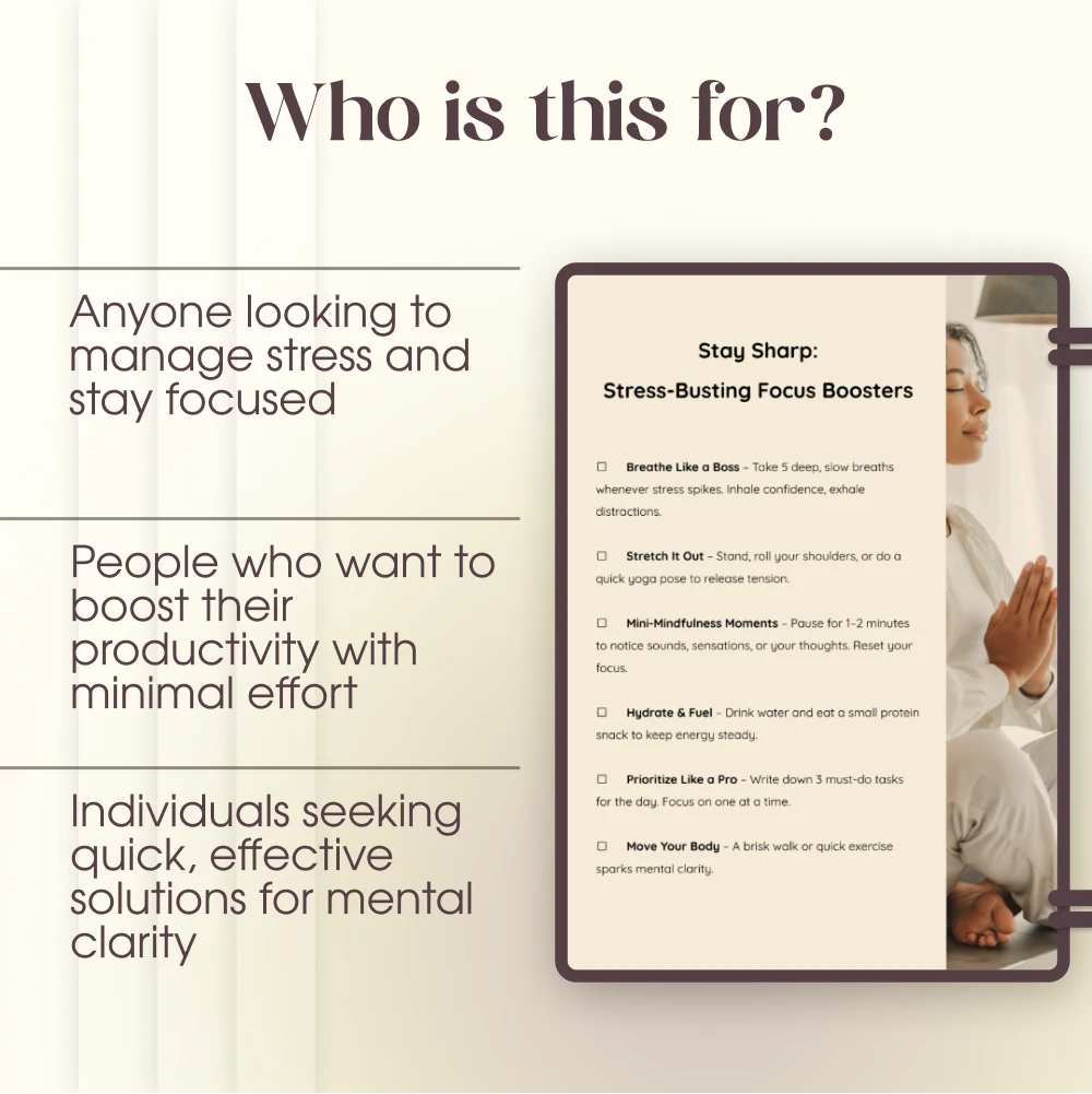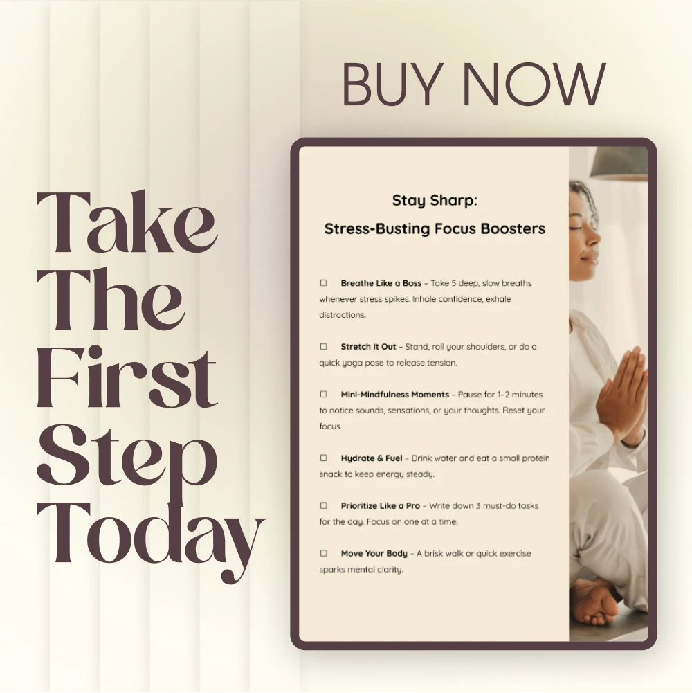 If you’re tired of feeling overwhelmed, distracted, or stressed, the “Stay Sharp: Stress-Busting Focus Boosters” digital guide is your solution. It’s your go-to resource for quick, easy, and effective ways to boost your focus, reduce stress, and regain control of your day. Download it today to start living with more clarity, calm, and confidence!