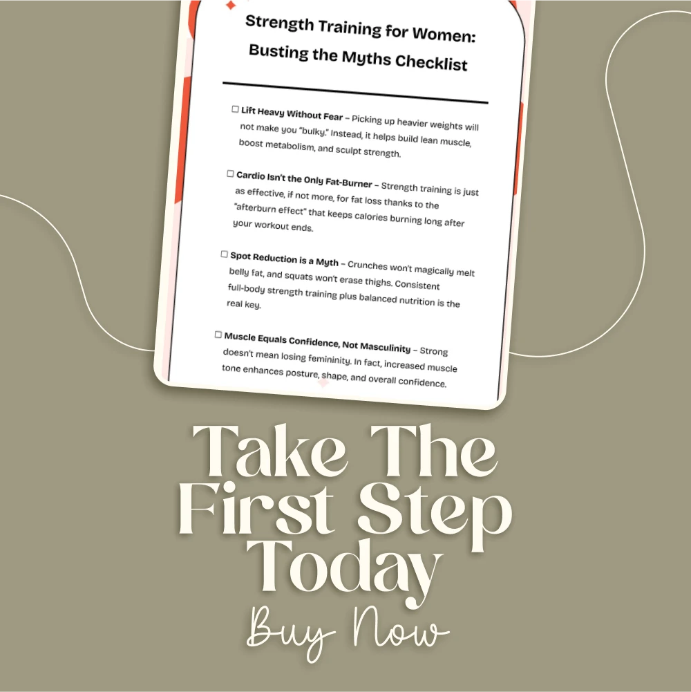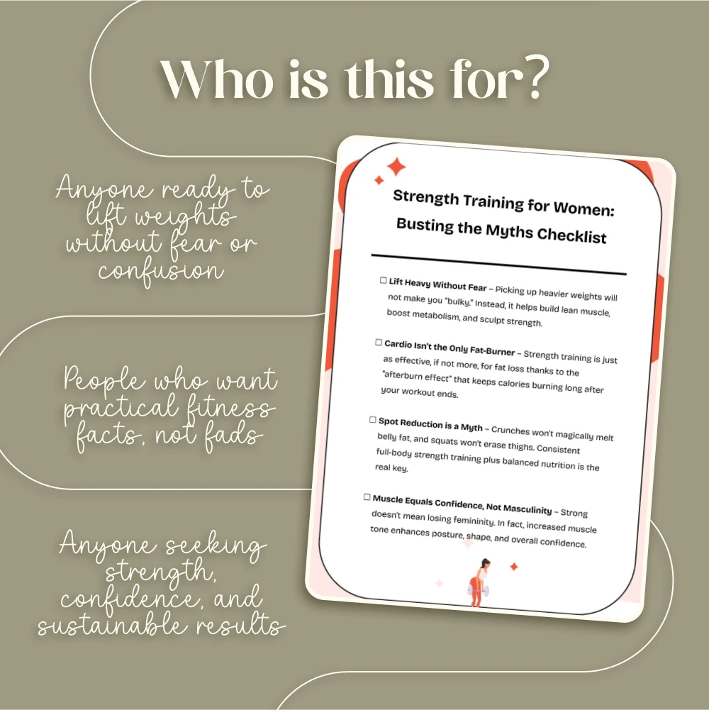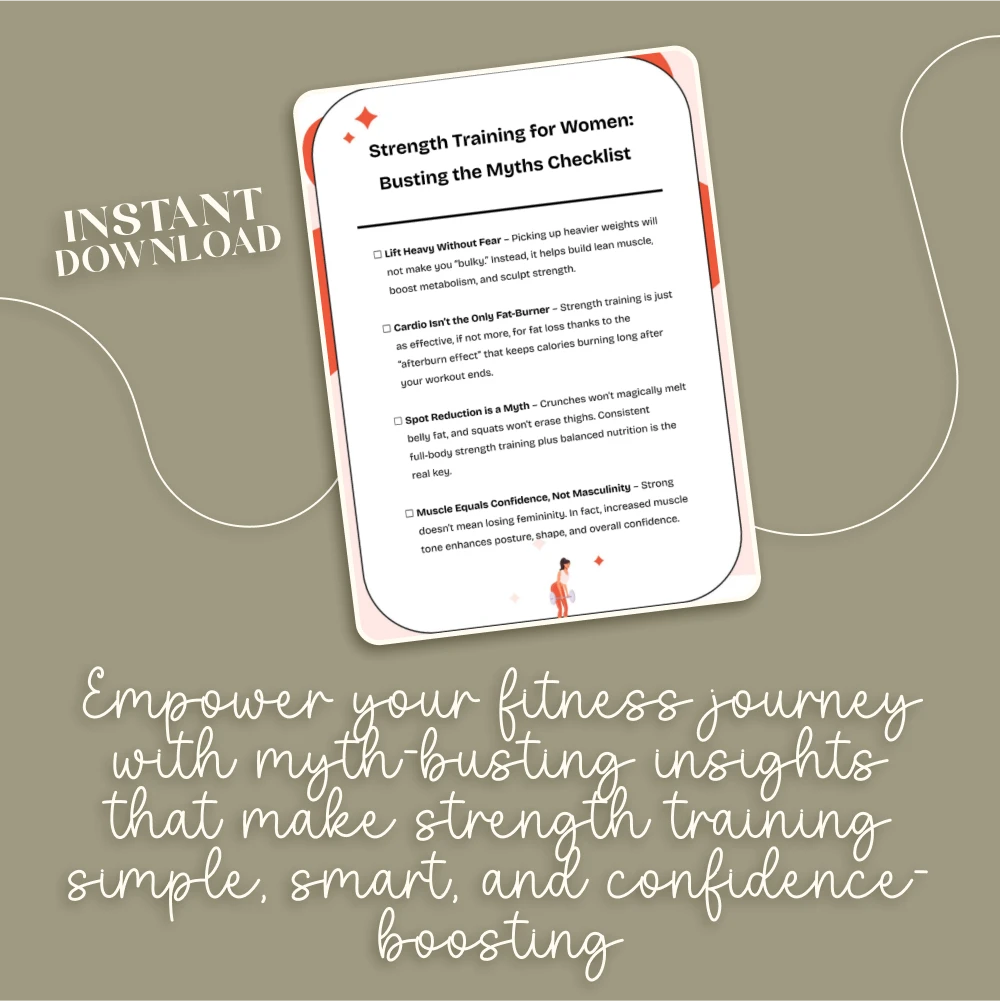 It’s time to rewrite your fitness story. Download the Strength Training for Women: Busting the Myths Checklist today and step into a stronger, more confident version of yourself—no gym fear, no confusion, just results. Click “Add to Cart” and start lifting smarter, not harder!