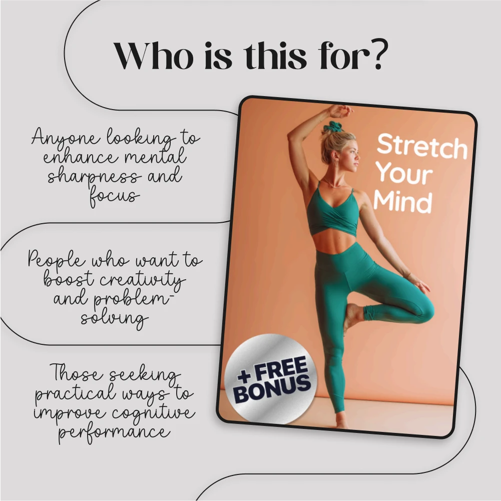 Unlike other digital resources that focus solely on physical fitness or mental exercises, “Stretch Your Mind” combines both elements seamlessly. With stretching routines that are backed by science and AI prompts designed to improve cognitive function, this guide is your holistic approach to boosting mental clarity and creativity. Plus, it’s designed for busy people who need simple, effective techniques to stay sharp throughout the day.