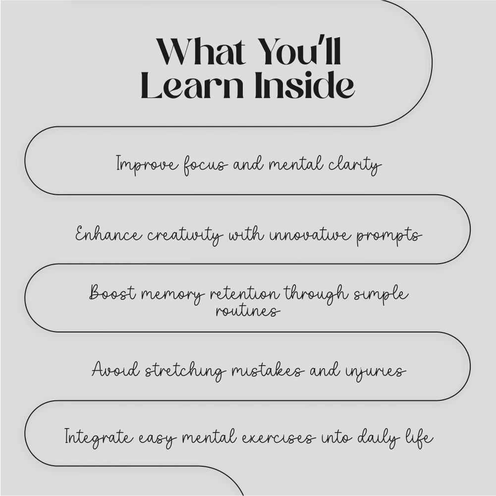 “Stretch Your Mind” is for anyone who wants to enhance their mental sharpness, creativity, and overall cognitive performance through the simple but effective practice of stretching. Whether you’re a busy professional, a student, a creative, or someone looking to improve focus and memory, this guide is your go-to resource for improving your brainpower every day.