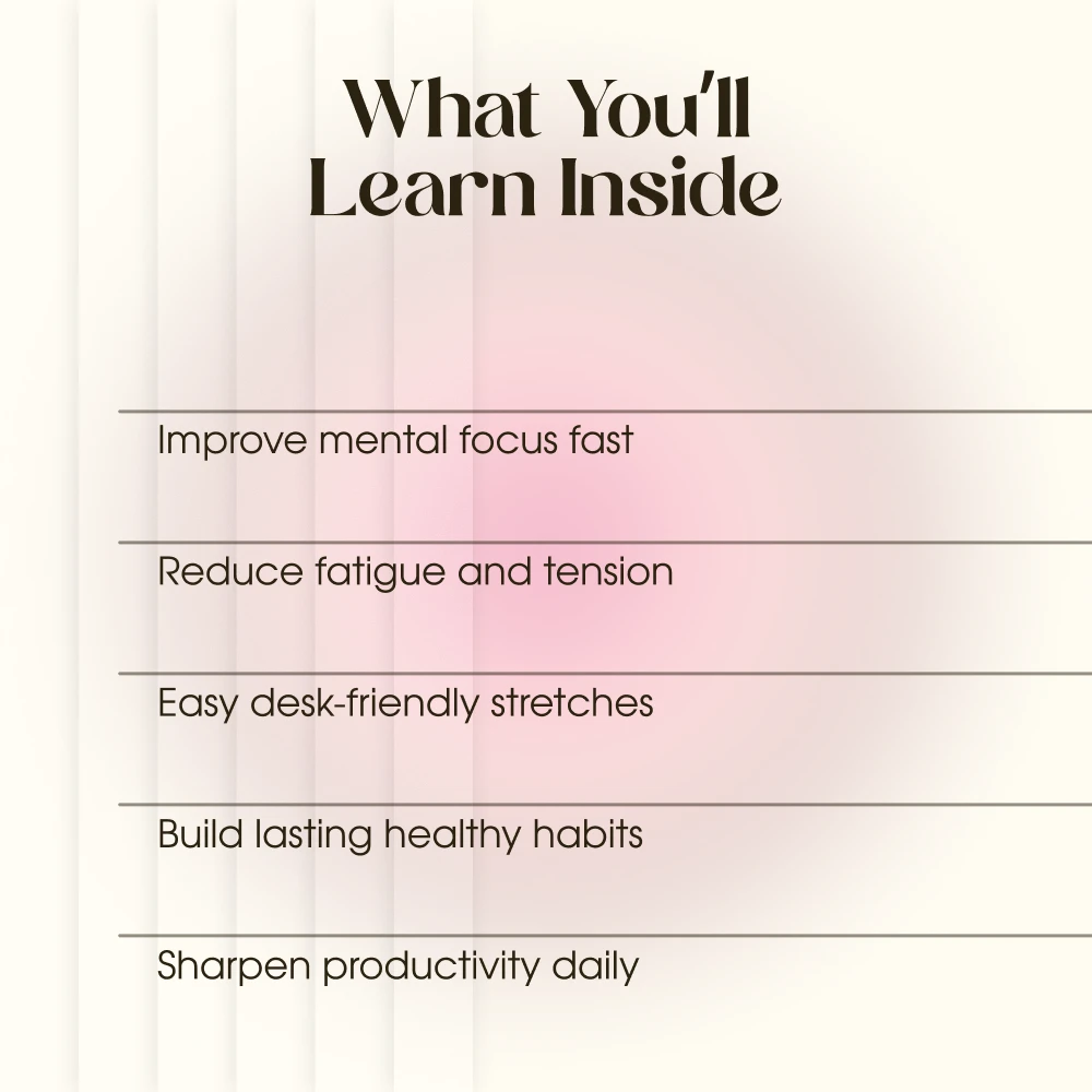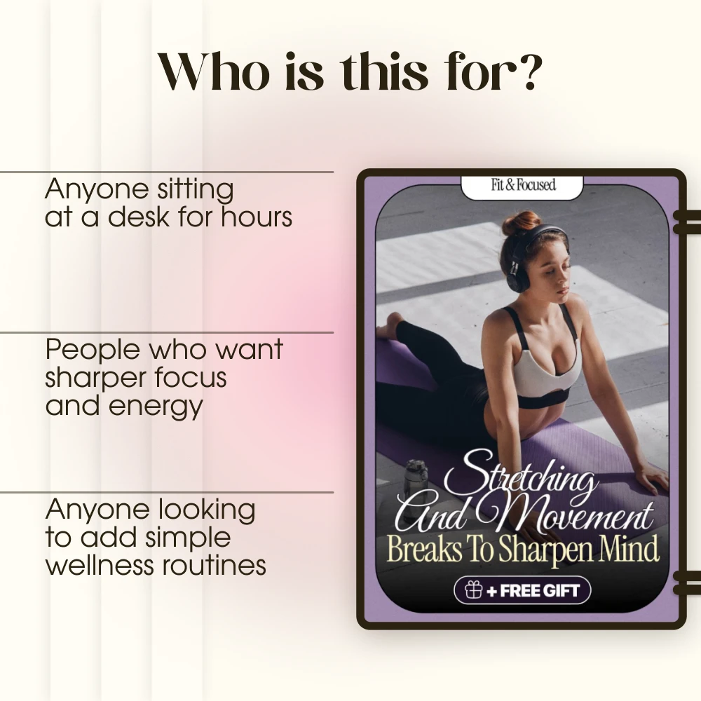This guide is perfect for students, professionals, entrepreneurs, and anyone who wants to sharpen their mind during long hours of work or study. If you often feel sluggish, distracted, or drained, this resource will help you reclaim focus through stretching and movement breaks for focus—without overhauling your lifestyle.
