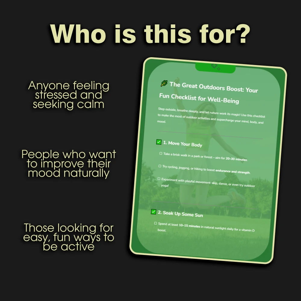 This is for anyone who wants to feel better but isn’t sure how. It’s for the busy professional feeling burned out, the parent looking for fun family activities, the student needing a study break, or anyone seeking a more mindful and joyful connection to the world around them. If you want a straightforward, no-fluff resource to help you harness the benefits of outdoor activities for well-being, this checklist is your perfect companion.