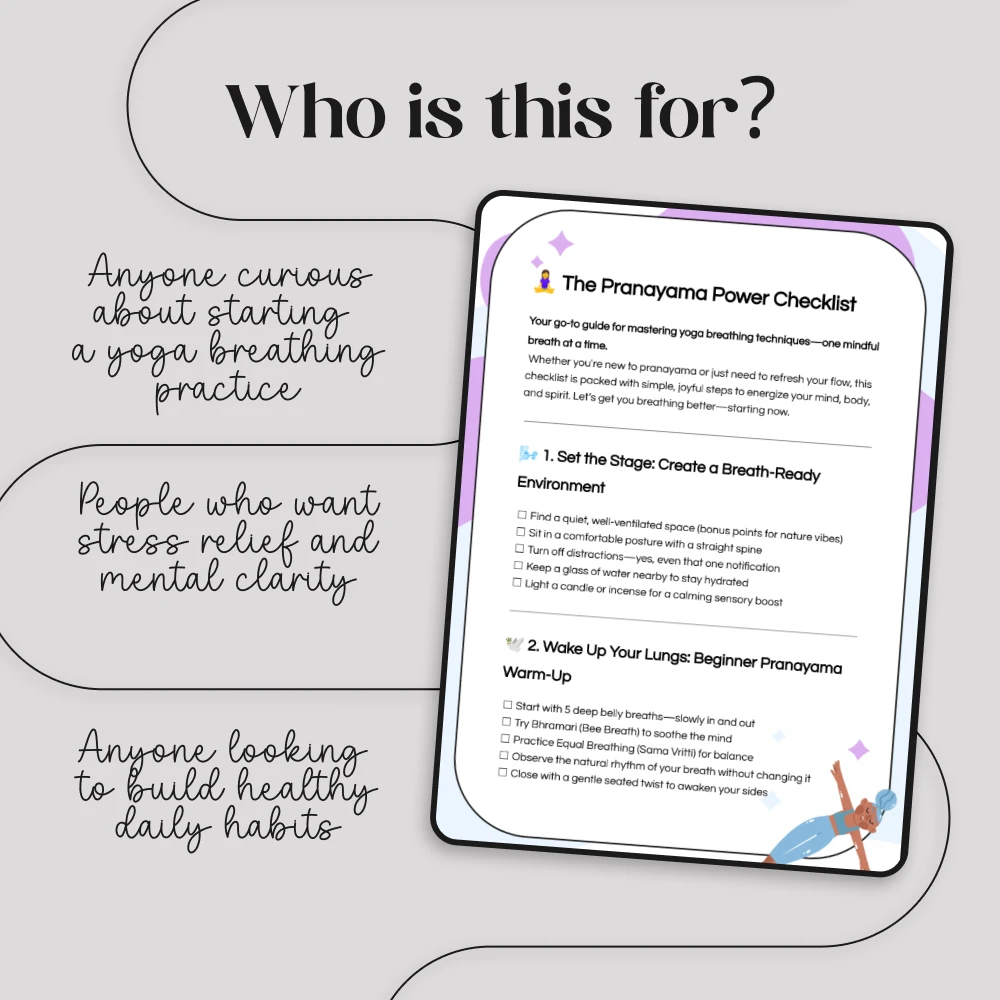 This checklist is ideal for yoga enthusiasts, busy professionals, wellness seekers, and anyone curious about yoga pranayama practices. It’s designed to be easy enough for beginners yet valuable for those wanting to deepen their daily breathwork routine.