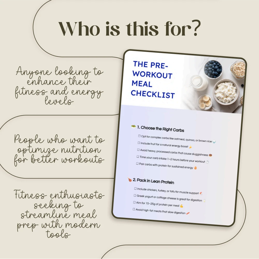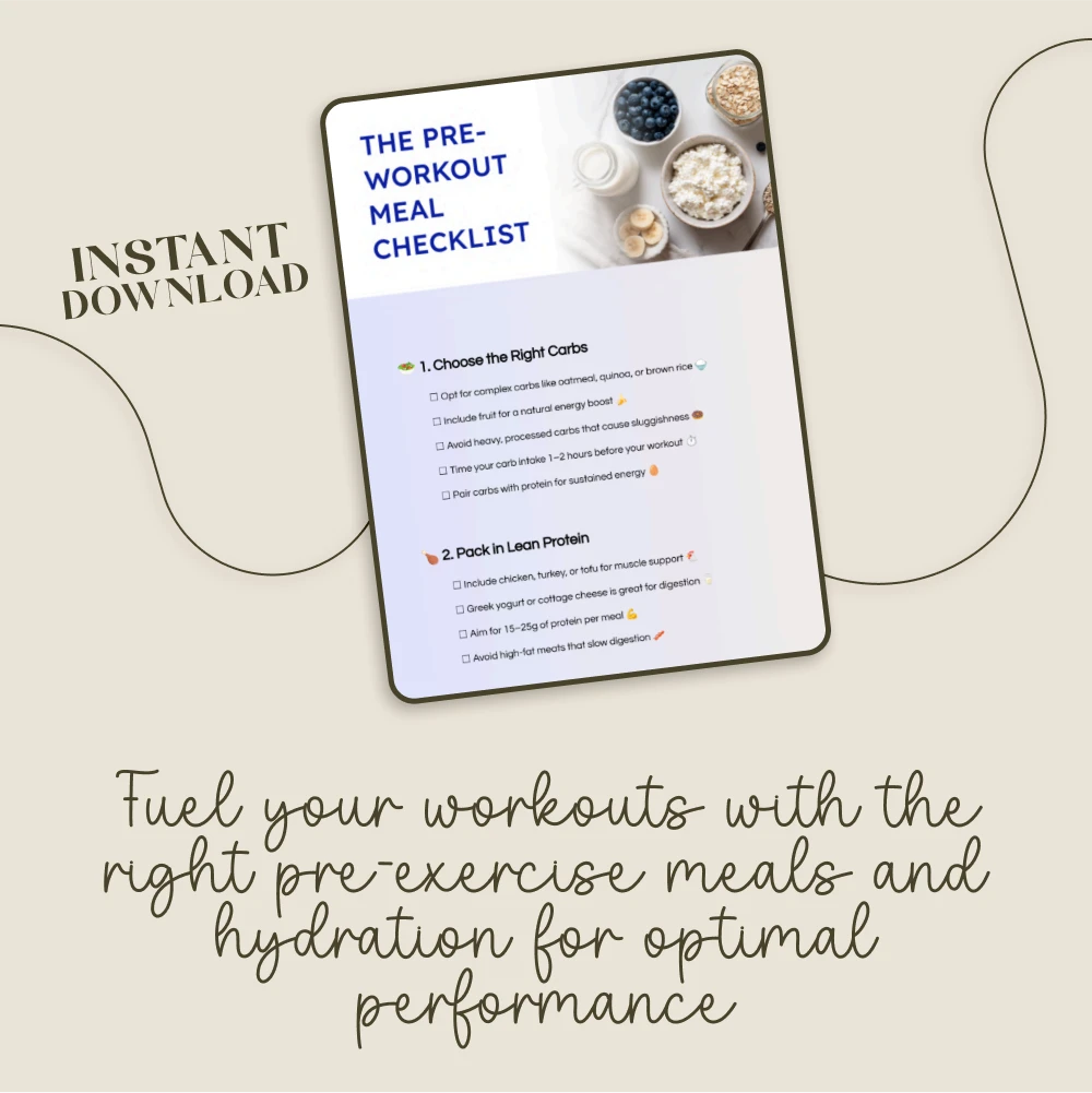 Ready to Fuel Your Workout? Download The Pre-Workout Meal Checklist today and start optimizing your meals for peak performance. Power your body with the right nutrition, so you can take your workouts to the next level!