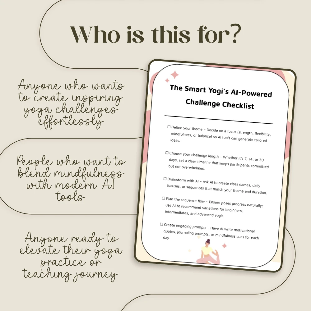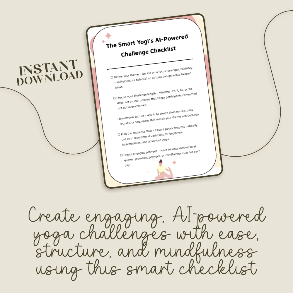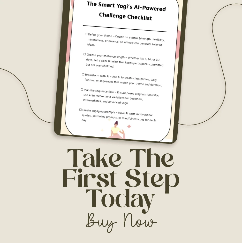 Download The Smart Yogi’s AI-Powered Challenge Checklist now and start building a beautifully structured, motivational yoga challenge that reflects your vision and inspires your students. Your next breakthrough offering begins here!