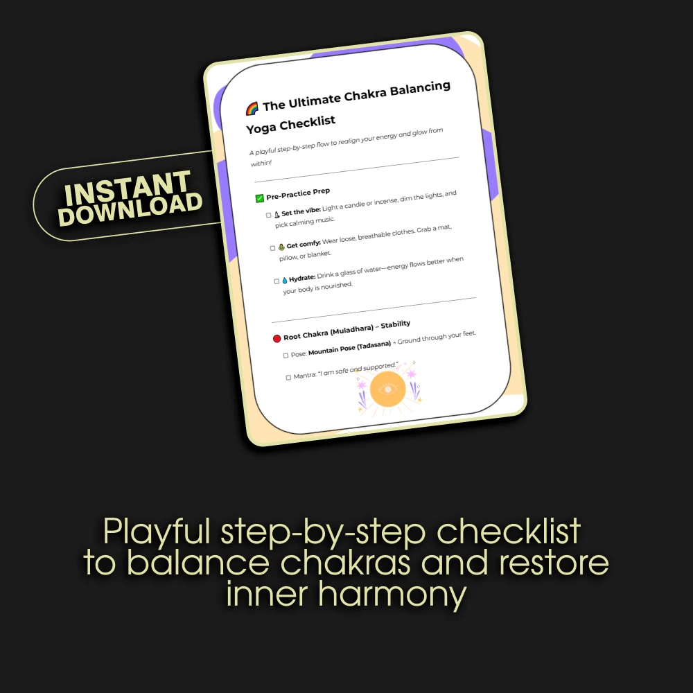 Bring harmony, energy, and inner peace into your daily practice with The Ultimate Chakra Balancing Yoga Checklist. Designed as a playful, step-by-step flow, this digital checklist guides you through yoga for chakra balancing with simple instructions, powerful mantras, and easy-to-follow tips. Whether you’re new to chakra work or looking to deepen your existing practice, this resource offers a beautifully organized path to realign your energy centers and glow from within.