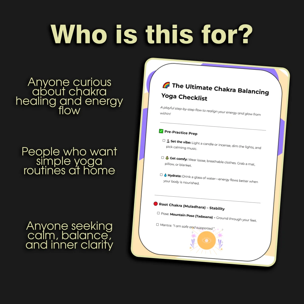 This checklist is for anyone seeking a balanced life through yoga for chakra balancing. Whether you’re a busy beginner wanting guidance, a yoga enthusiast adding depth to your practice, or a wellness coach sharing tools with clients, this resource fits seamlessly into your journey.
