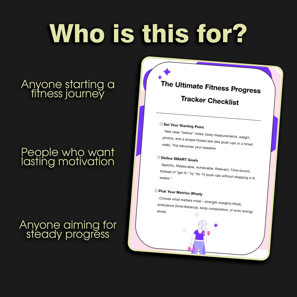 Unlike generic trackers, The Ultimate Fitness Progress Tracker Checklist goes beyond numbers. It combines measurable metrics with mindset and motivation, helping you stay connected to your “why.” With clear prompts and actionable steps, you’ll know exactly what to track, when to check in, and how to celebrate each milestone.