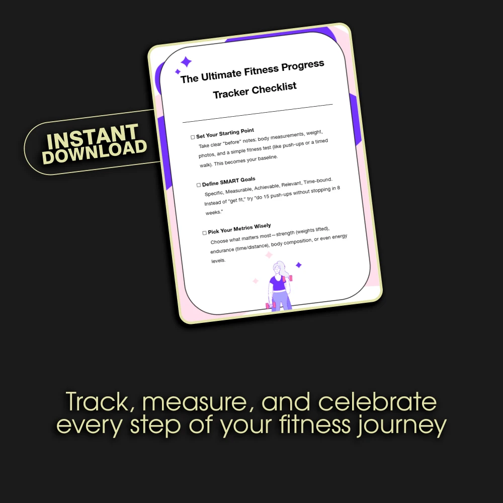 Ready to finally see real results from your workouts? The Ultimate Fitness Progress Tracker Checklist is your all-in-one digital guide to mastering how to track fitness progress with clarity and confidence. Whether you’re just starting your journey or leveling up your routine, this downloadable checklist helps you stay organized, motivated, and accountable—so you can celebrate every win along the way. Designed with simplicity and science in mind, this tool transforms your fitness journey from guesswork into a measurable success story.