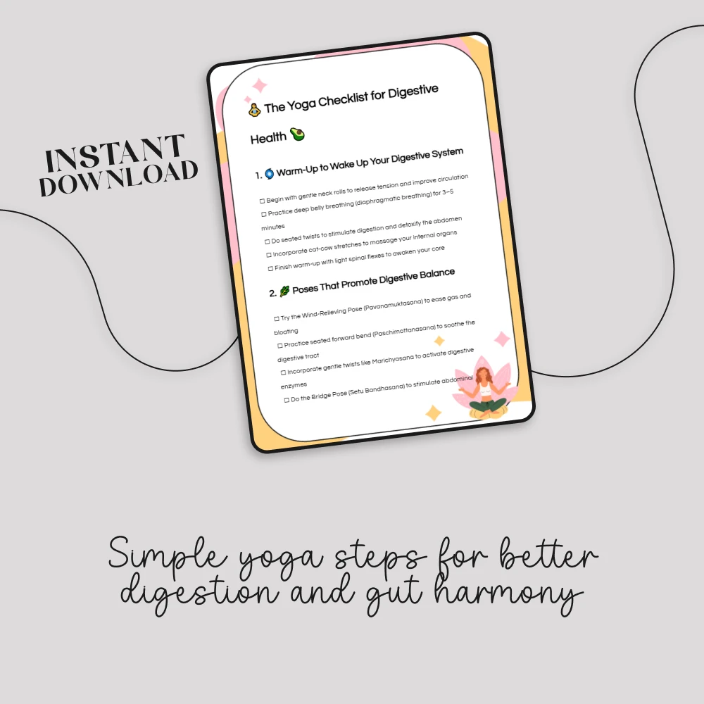 Discover a simple yet powerful way to nurture your gut and calm your mind with The Yoga Checklist for Digestive Health. This beautifully designed digital download blends ancient yoga wisdom with modern mindfulness practices to help you restore balance, ease bloating, and support a healthy gut-brain connection. Whether you’re new to yoga or looking to enhance your wellness journey, this checklist gives you a step-by-step plan to move, breathe, and live in harmony with your digestion. Perfect for your morning flow, post-meal reset, or evening unwind ritual.