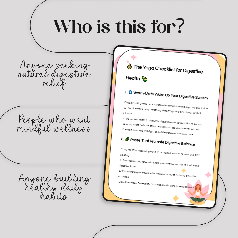 This guide is perfect for anyone seeking natural ways to support digestive health—yoga beginners, wellness enthusiasts, busy professionals, and anyone curious about integrating yoga for digestive health into their lifestyle. If you value holistic wellness and mindful living, this checklist is your daily companion for gut-friendly balance.