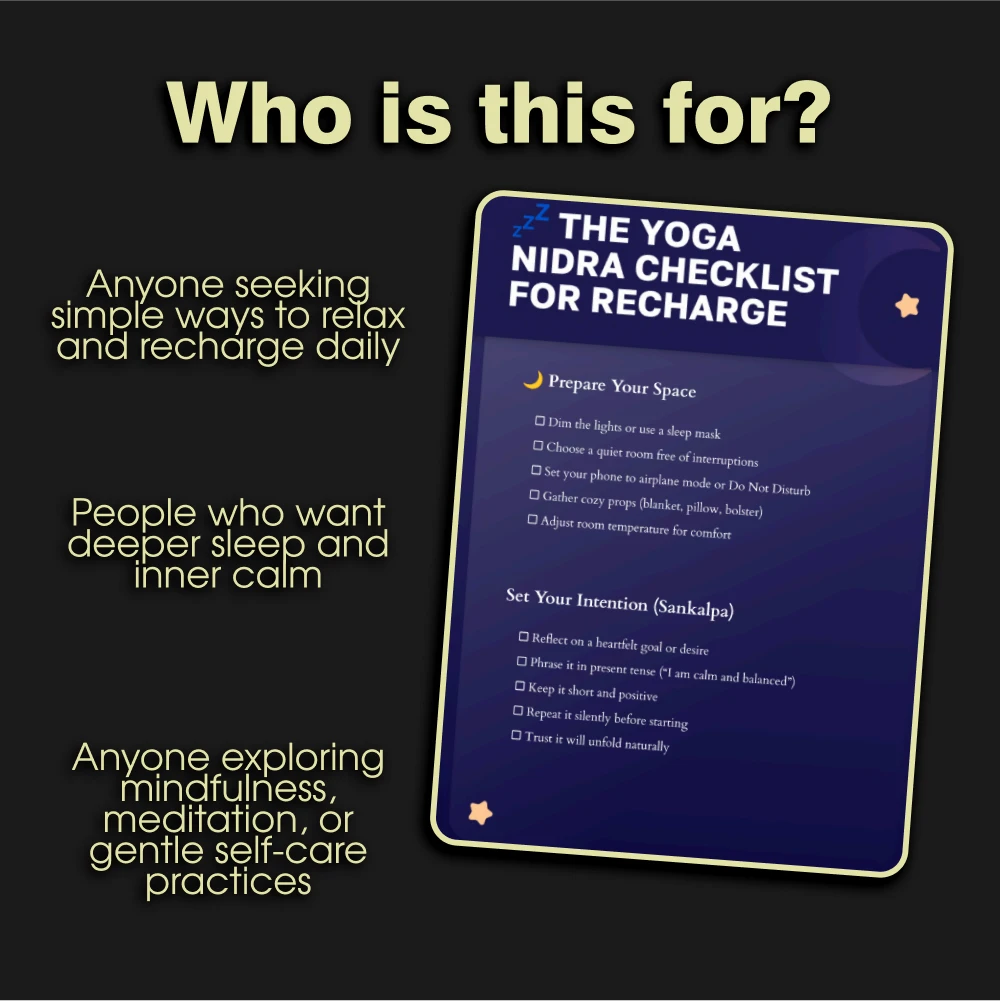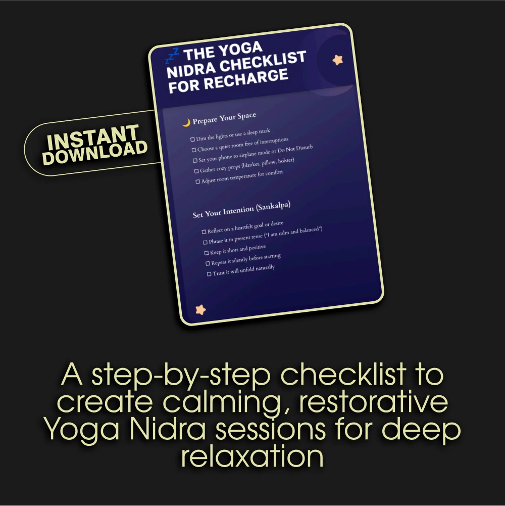 Bring balance back into your life and awaken your inner stillness. Download The Yoga Nidra Checklist for Recharge today and start your journey toward calm, clarity, and complete relaxation. Your most peaceful self awaits—click “Add to Cart” and enjoy instant access to your new favorite mindfulness companion!