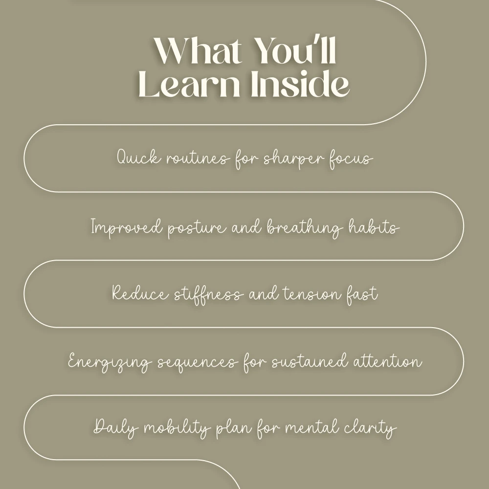 - Learn simple, guided full-body mobility sequences for focus that fit into any schedule.