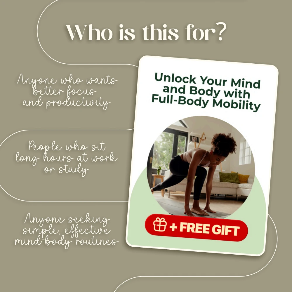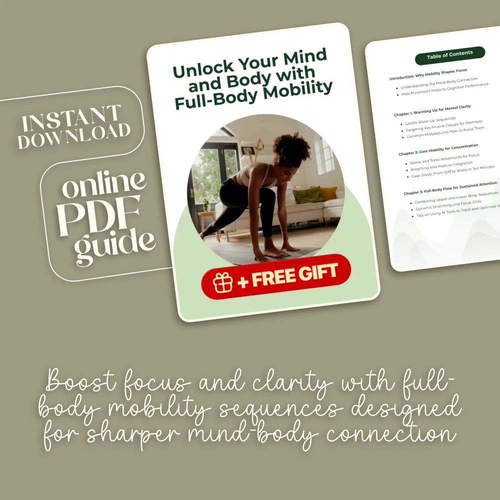 Enhance your focus and sharpen your mind through movement with the Unlock Your Mind and Body with Full-Body Mobility digital guide. Designed for anyone who wants to combine physical freedom with mental clarity, this guide gives you practical, science-backed full-body mobility sequences for focus. Whether you’re working long hours, studying for exams, or simply aiming to improve your daily mental performance, this resource is built to help you move better and think sharper.
