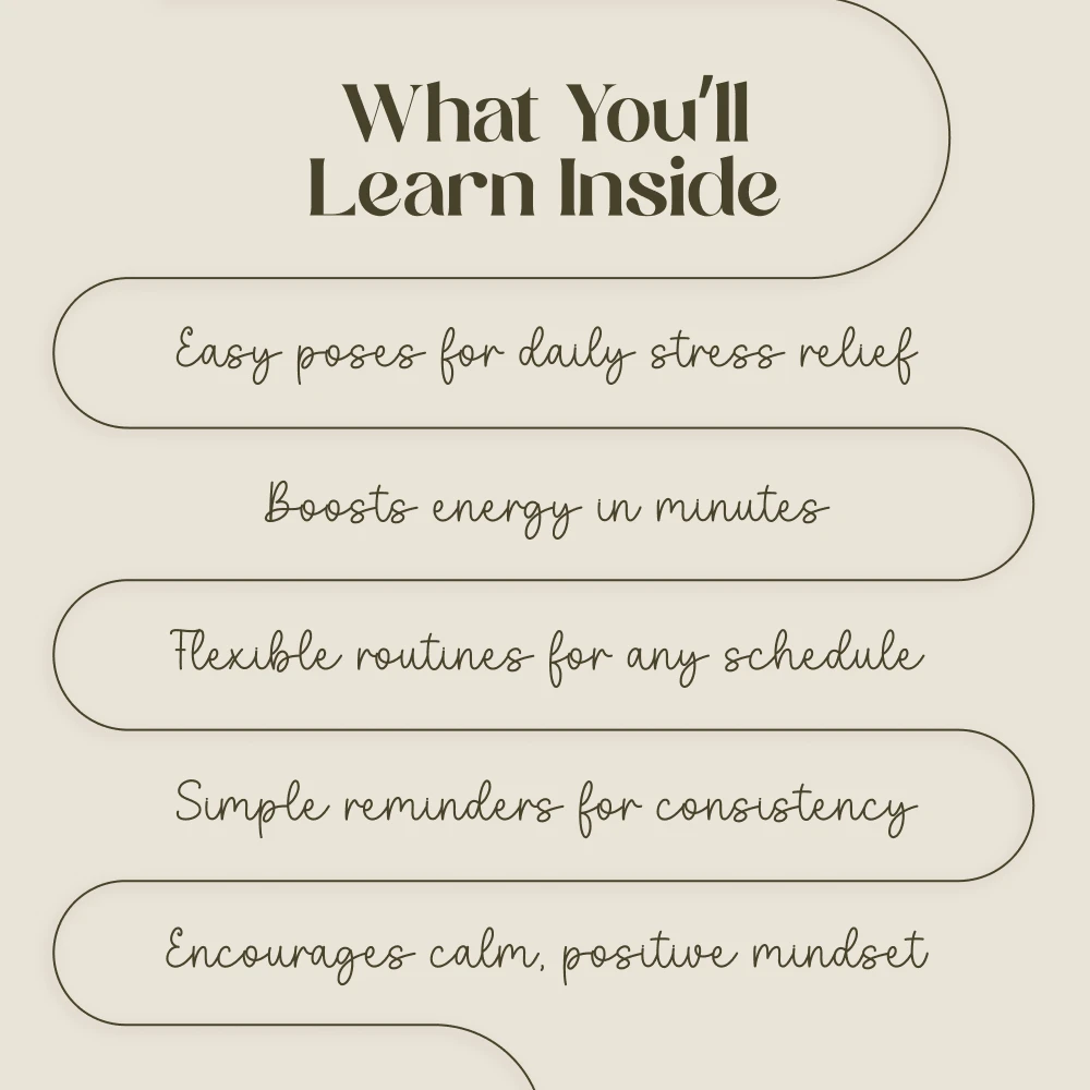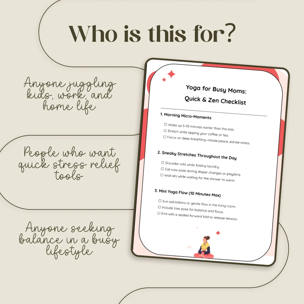Unlike lengthy yoga programs, Yoga for Busy Moms: Quick & Zen Checklist is built with flexibility in mind. It’s tailored for women who want the benefits of yoga but don’t have an hour to dedicate every day. You’ll find creative ways to integrate yoga into daily routines, making wellness achievable and realistic—even in a packed schedule.