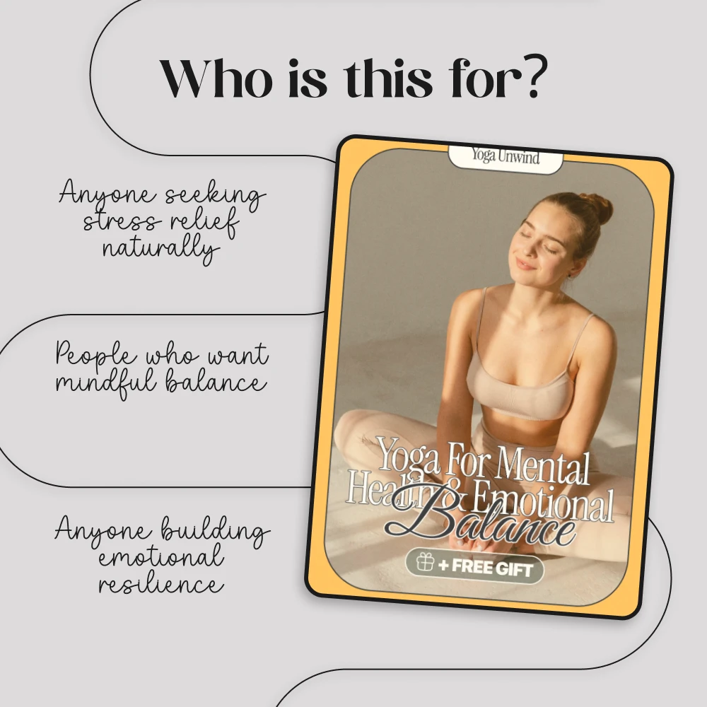 Download your copy today and start using yoga for mental health to reduce stress, find balance, and cultivate lifelong emotional wellbeing. Take the first step toward a calmer, more grounded you—your mind and body will thank you.