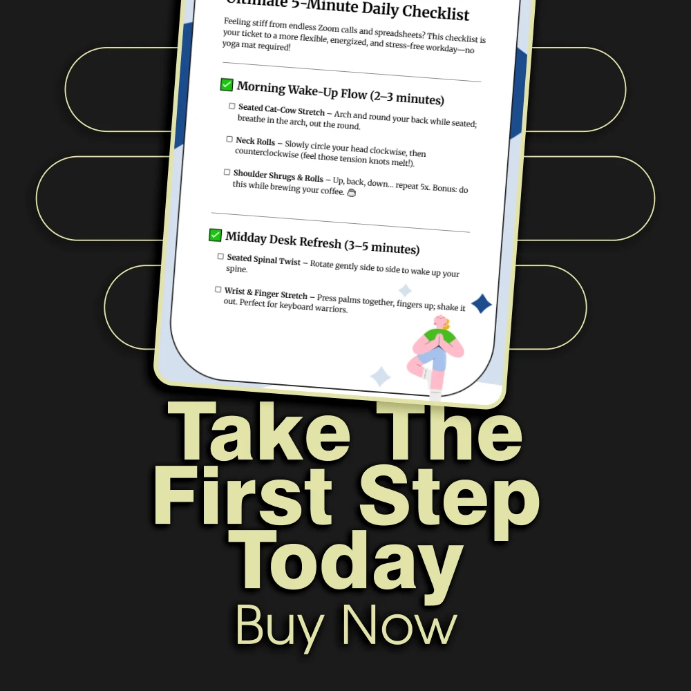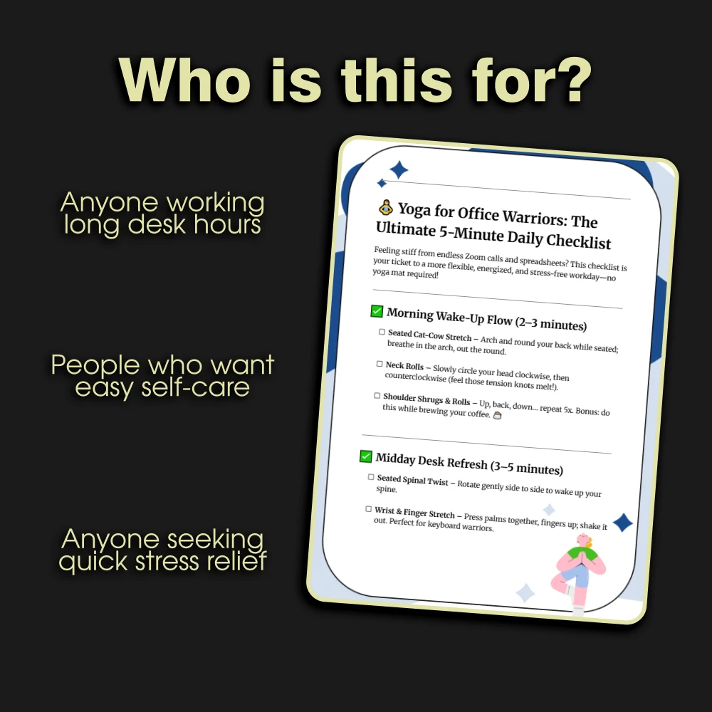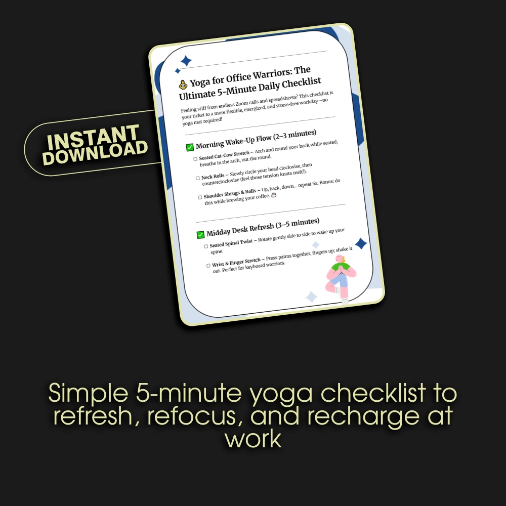 Don’t wait to feel better at work—download Yoga for Office Warriors: The Ultimate 5-Minute Daily Checklist now and transform your workday into a wellness ritual. Treat your body, fuel your focus, and embrace mindful movement—all in minutes a day. Your healthier, happier workday starts here!