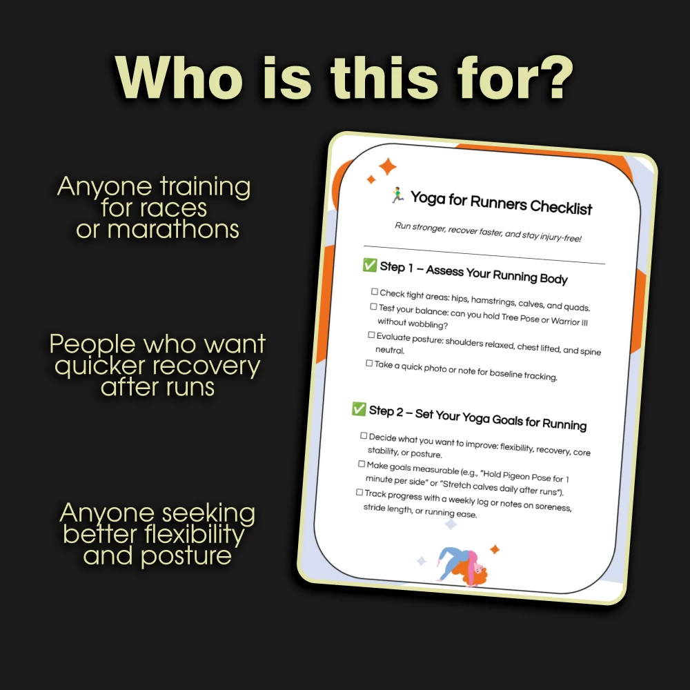 This digital checklist is perfect for runners who want to add yoga for runners into their routine without overcomplicating it. Beginners, casual joggers, and serious athletes alike will find it easy to follow, practical, and adaptable to any training schedule.