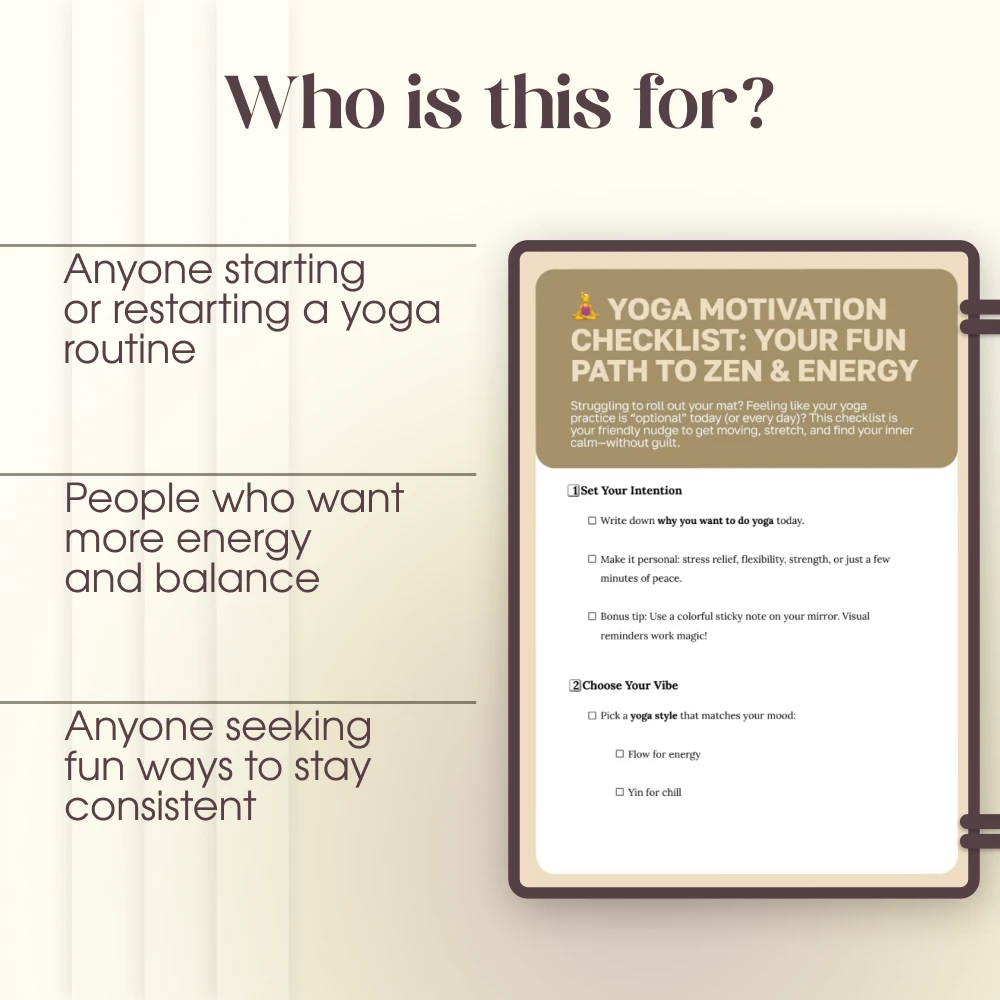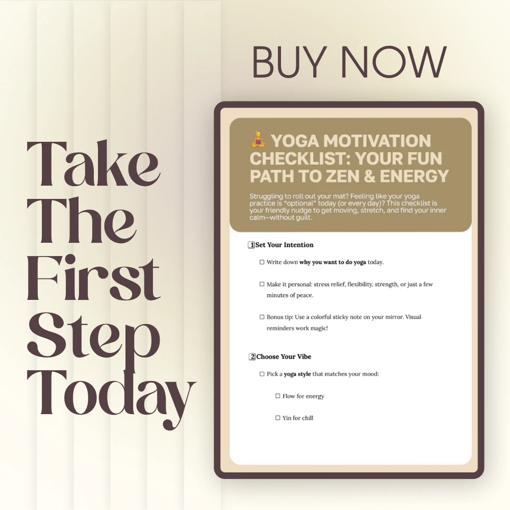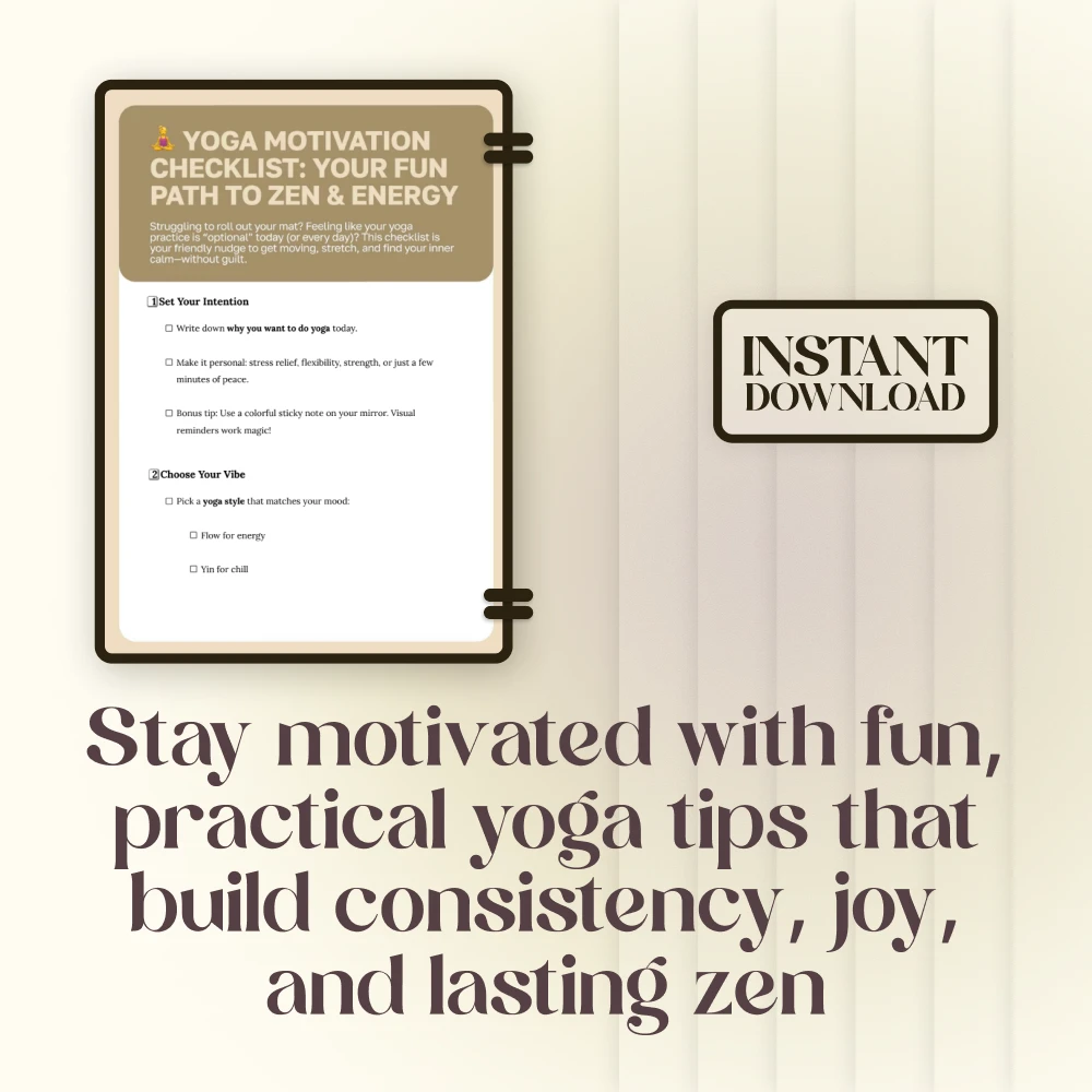 Download the Yoga Motivation Checklist: Your Fun Path to Zen & Energy today and make your practice something you look forward to every single time. Turn small steps into big progress—your journey to energy, focus, and calm begins now!