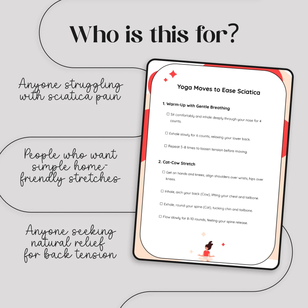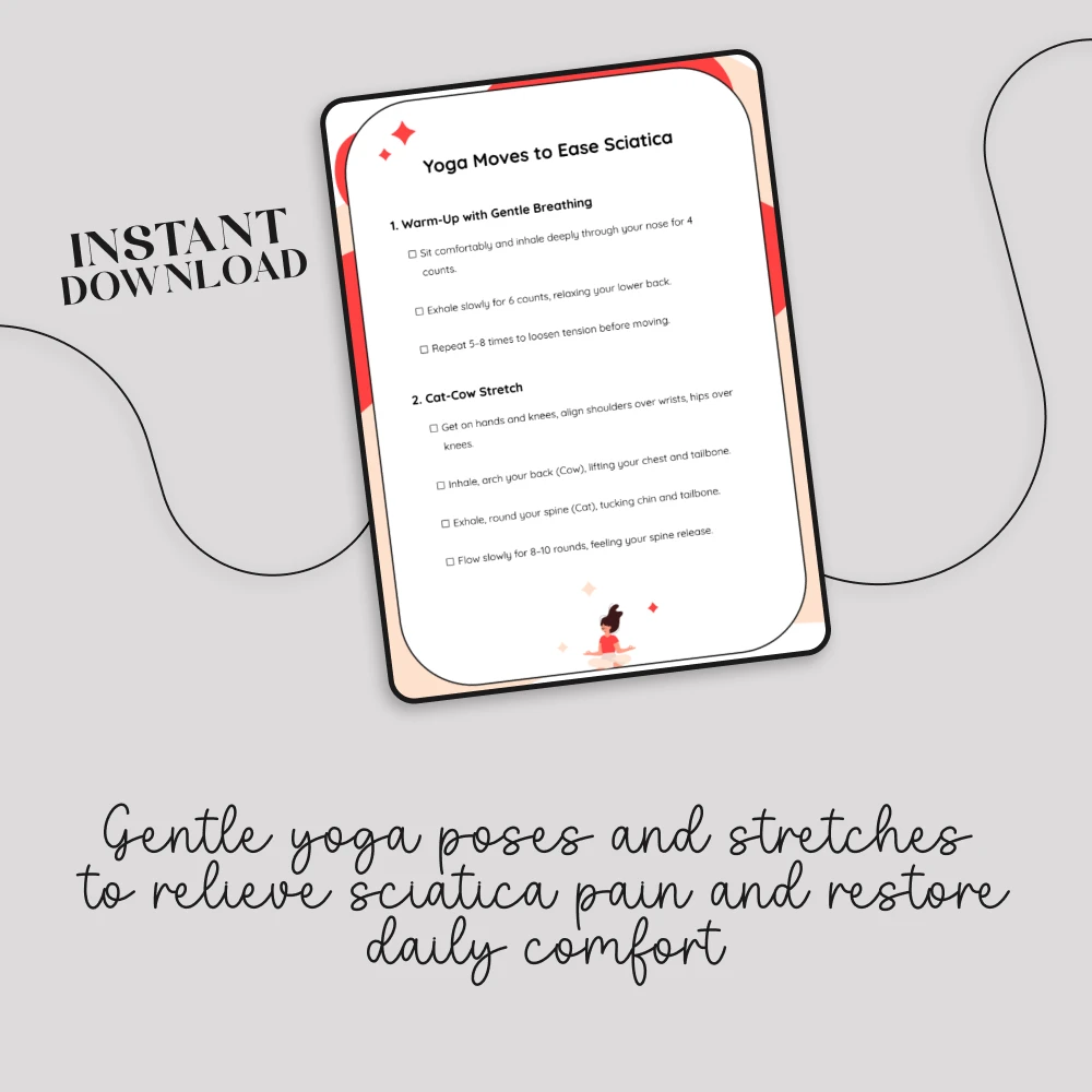 Struggling with sciatica pain can make even simple movements feel overwhelming. Yoga Moves to Ease Sciatica is a carefully designed digital checklist that provides a simple, supportive flow of yoga for sciatica pain relief. Whether you’re new to yoga or looking for a focused routine, this easy-to-follow guide will help you stretch, release tension, and find comfort—all from the convenience of home.