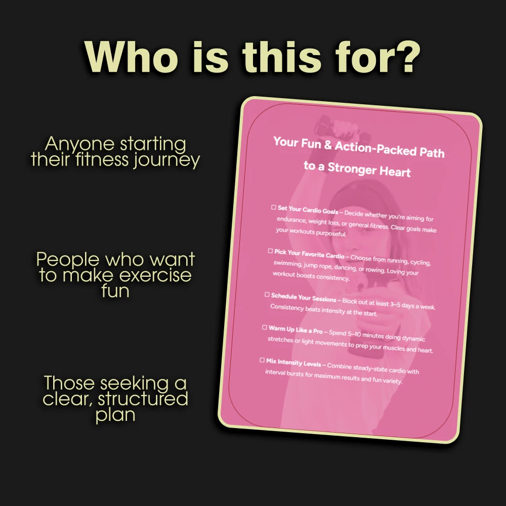 This checklist is the perfect starting point for cardio beginners who feel lost, and it’s a fantastic reset for seasoned exercisers stuck in a rut. It’s for the busy parent, the office worker, and anyone who wants to take control of their heart health with a straightforward, fun, and action-packed system. If you’ve ever bought a complicated fitness program only to feel intimidated, this simple, empowering checklist is your answer.
