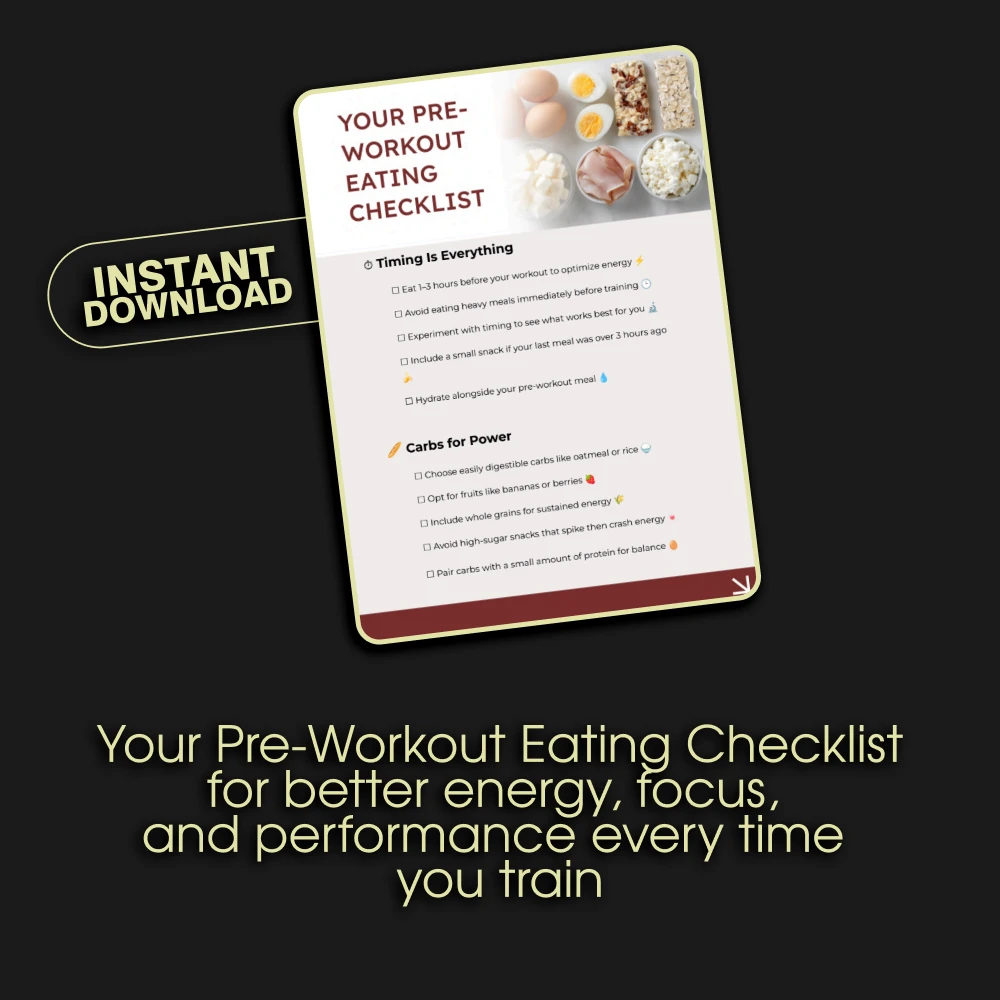Don’t let poor nutrition hold you back from reaching your fitness goals. Download Your Pre-Workout Eating Checklist today and give your body the fuel it deserves before every workout. Take control of your energy, boost your results, and enjoy the confidence of knowing you’re eating the right way—every time.