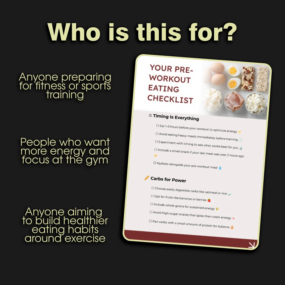 This checklist is perfect for anyone asking themselves what to eat before a workout. It’s designed for fitness beginners who want simple guidance, athletes seeking structured fuel strategies, or busy people who need quick meal and snack inspiration before exercise. If you want to feel strong, energized, and ready to perform, this is for you.