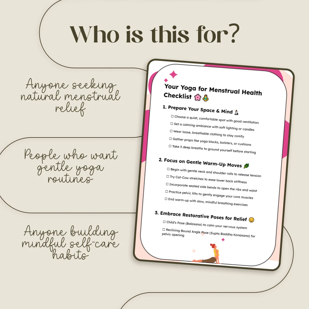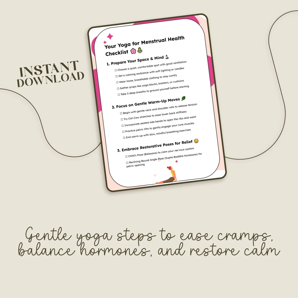 This checklist is ideal for anyone looking to support hormonal balance, ease menstrual discomfort, and establish a mindful yoga ritual. Whether you’re a beginner exploring yoga for menstrual health or an experienced yogi seeking gentle guidance, this resource meets you where you are.
