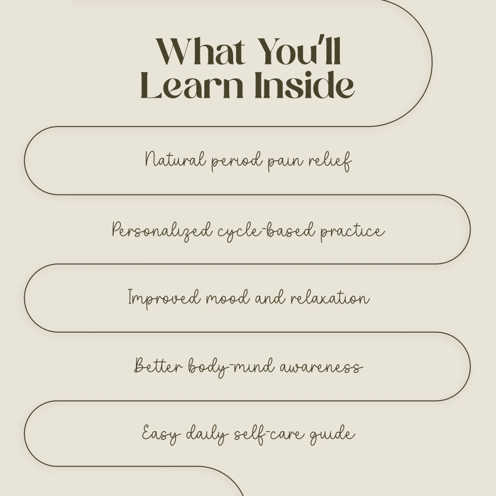 - Step-by-Step Checklists: From preparing your space to selecting poses and tracking your cycle.